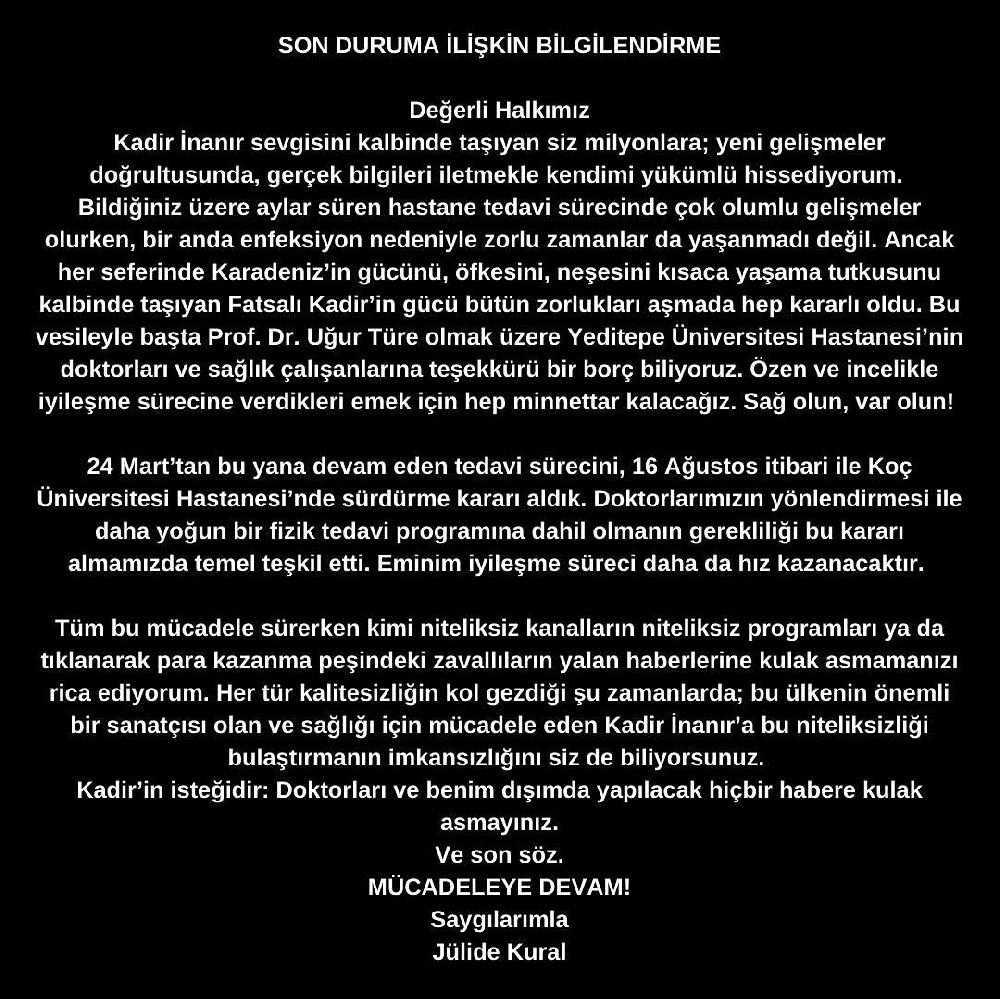 Evinde rahatsızlanarak Ümraniye Eğitim ve Araştırma Hastanesi'ne kaldırılan Kadir İnanır, beyne pıhtı atması sonucu inme geçirmiş ve operasyona alınmıştı. Tedbir amaçlı entübe edilen sanatçı, 1 Nisan'da yoğun bakımdan çıkarılmıştı. Kadir İnanır hakkında felç geçirdiğine yönelik iddialar ortaya atılmıştı.