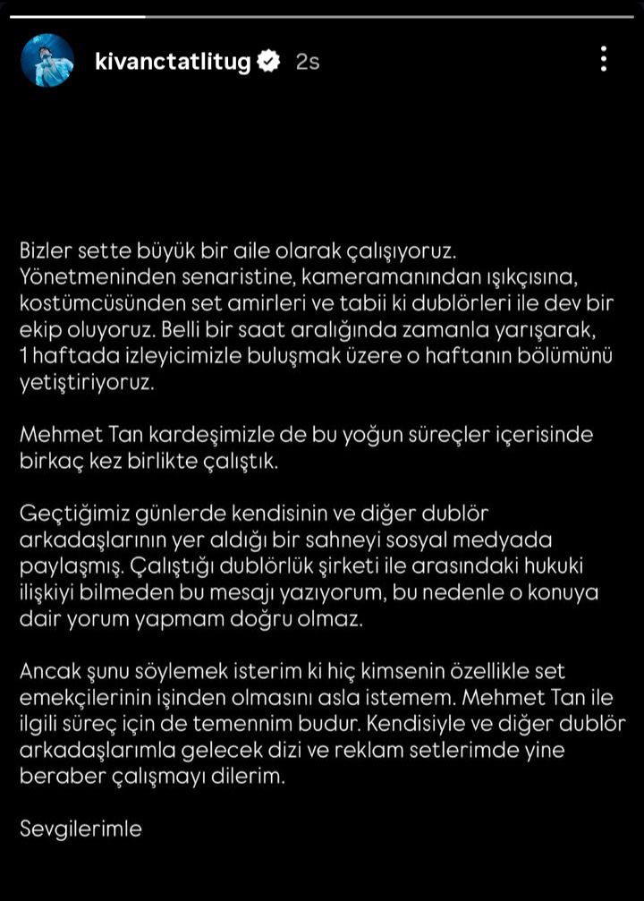 Aile dizisinde dublörlüğünü yapan Mehmet Tan’ın işten çıkarıldığını açıklamasının ardından Kıvanç Tatlıtuğ, açıklama yaptı.