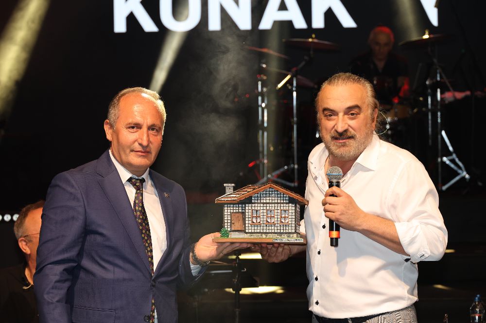 Arhavi Belediye Başkanı Turgay Ataselim ve İlçe Emniyet Müdürü Bünyamin Temur konser sonrası Konak'a, yörenin sembolü olan maket ev ve karayemiş meyvesi sepeti hediye etti.