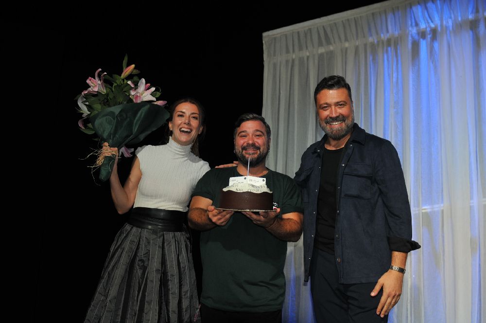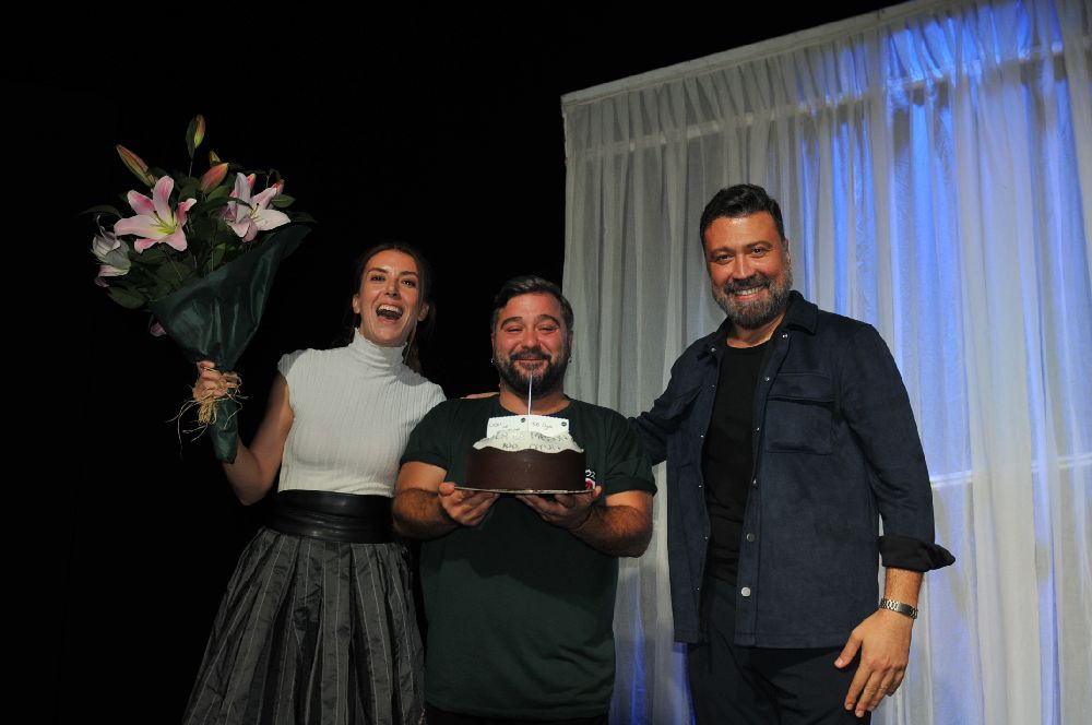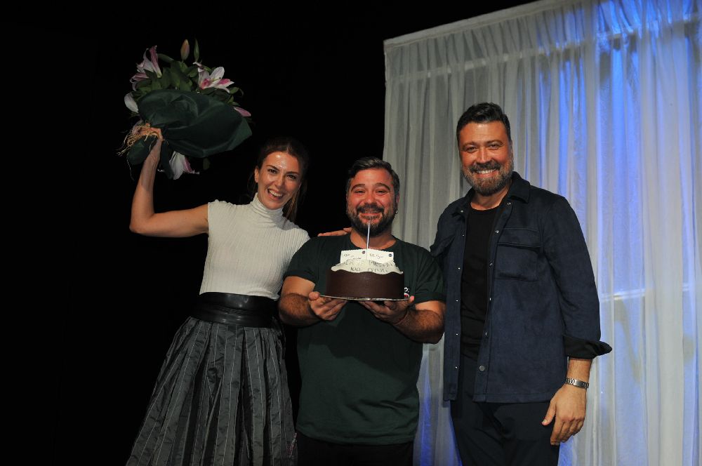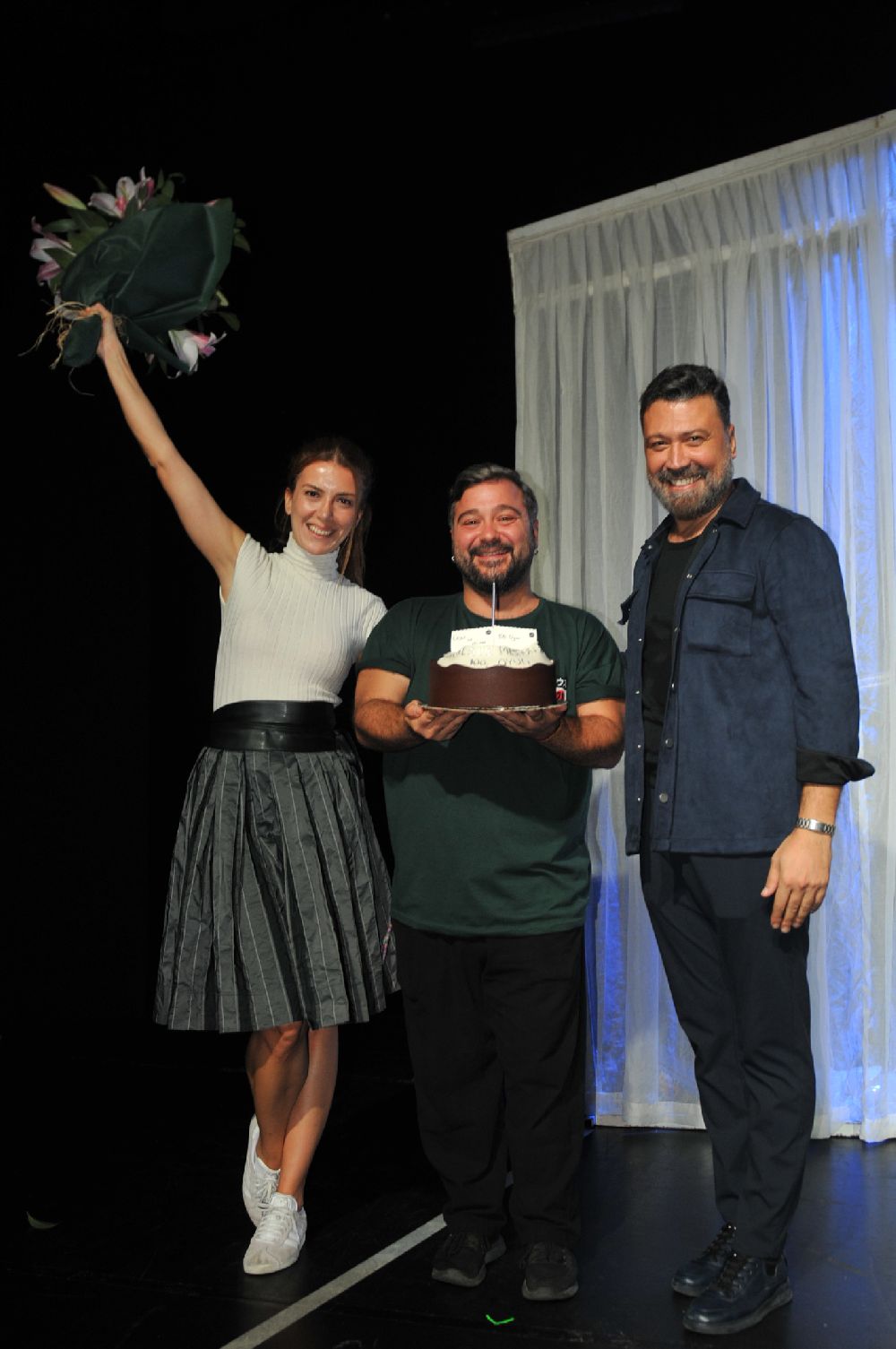 Oyun sonrasında sahnede pasta kesen ikili, seyircilerle birlikte bu özel anı kutladı.