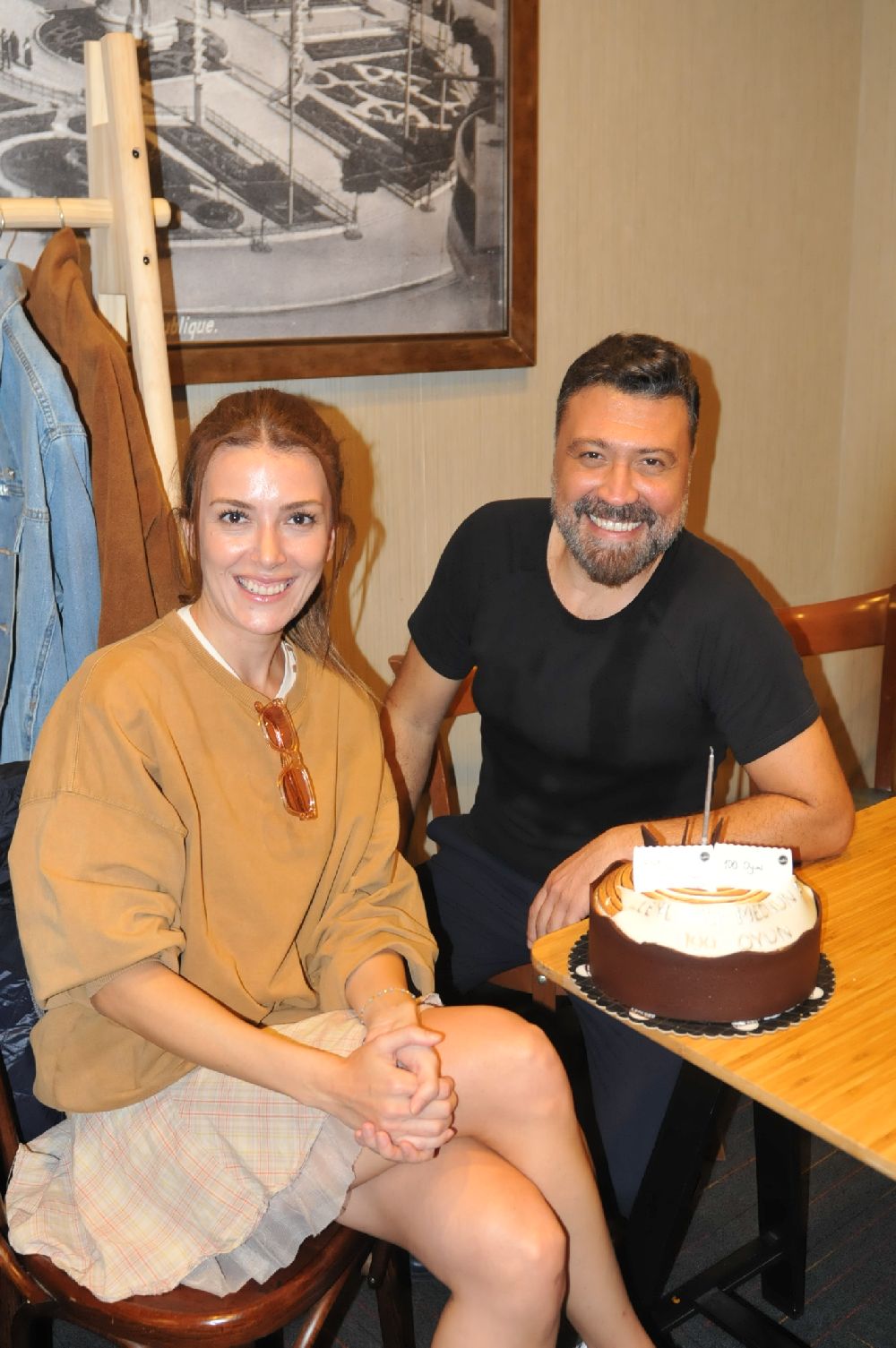 Seyirciyi selamlayan Parlak ve Çam, sahnede 100. oyunun pastasını üfleyerek dalya yaptı.