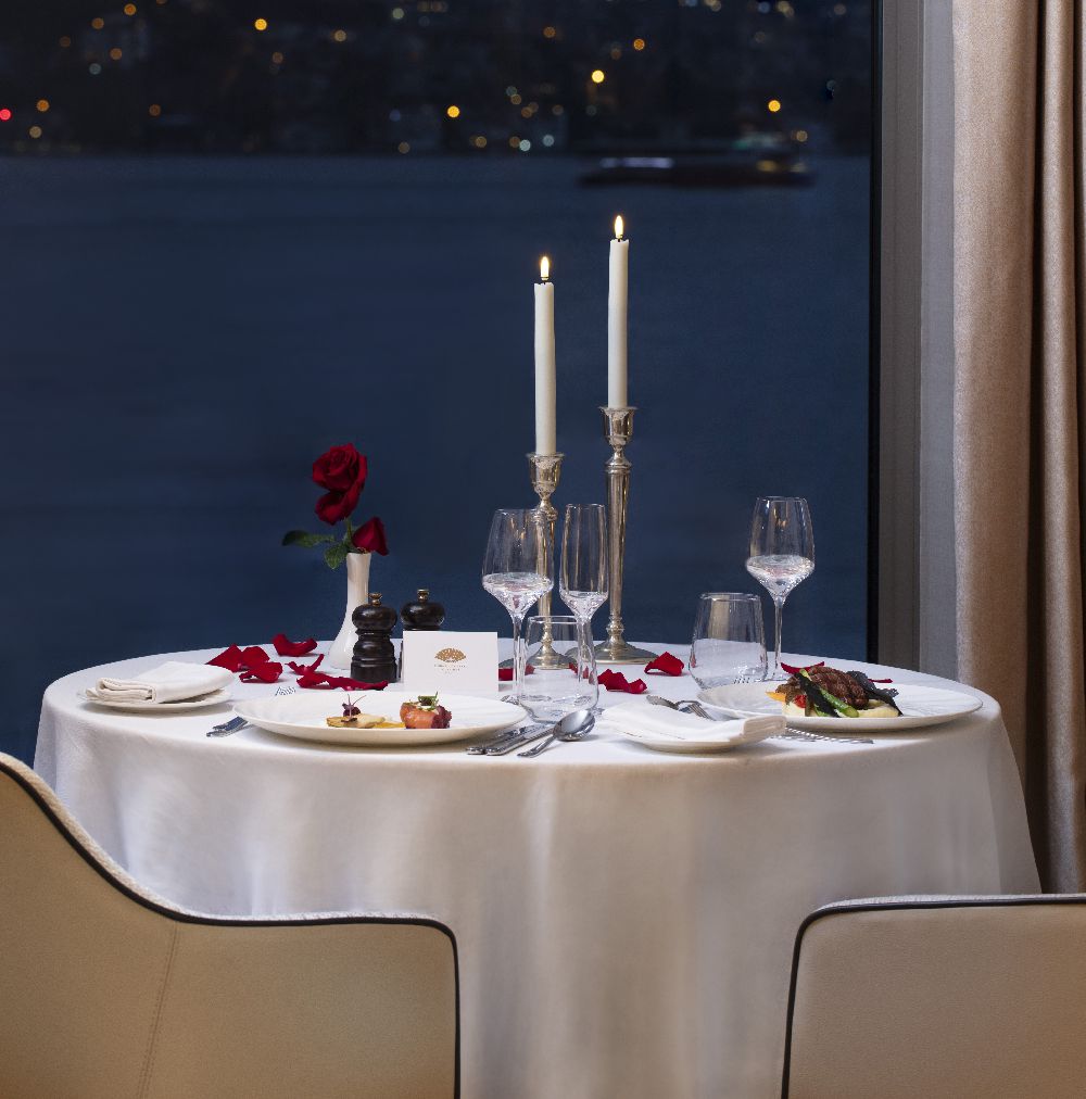 Sevgilisiyle baş başa romantik bir gece geçirmek isteyenler için akşam yemeği, kırmızı güllerle süslenmiş odalarda sunuluyor. Özel olarak hazırlanan menüde Havyar & Enginar Kalbi Hibiskus Marineli Somon, Kuşkonmaz, Ispanak, adaçayı kreması, ceviz, Scamorza peynirinden oluşan Prenses Tacı Ravioli, Burrata Salatası, tavada kızartılmış Deniz Levreği veya Izgara Dana Madalyon gibi seçenekler yer alıyor. Aynı menü romantizmi büyülü anlara dönüştürmek için Boğaz’ın ışıltılı sularının hemen yanı başındaki özel Cabanalarda geceyi kutlamak isteyenlerin de masalarını süslüyor.