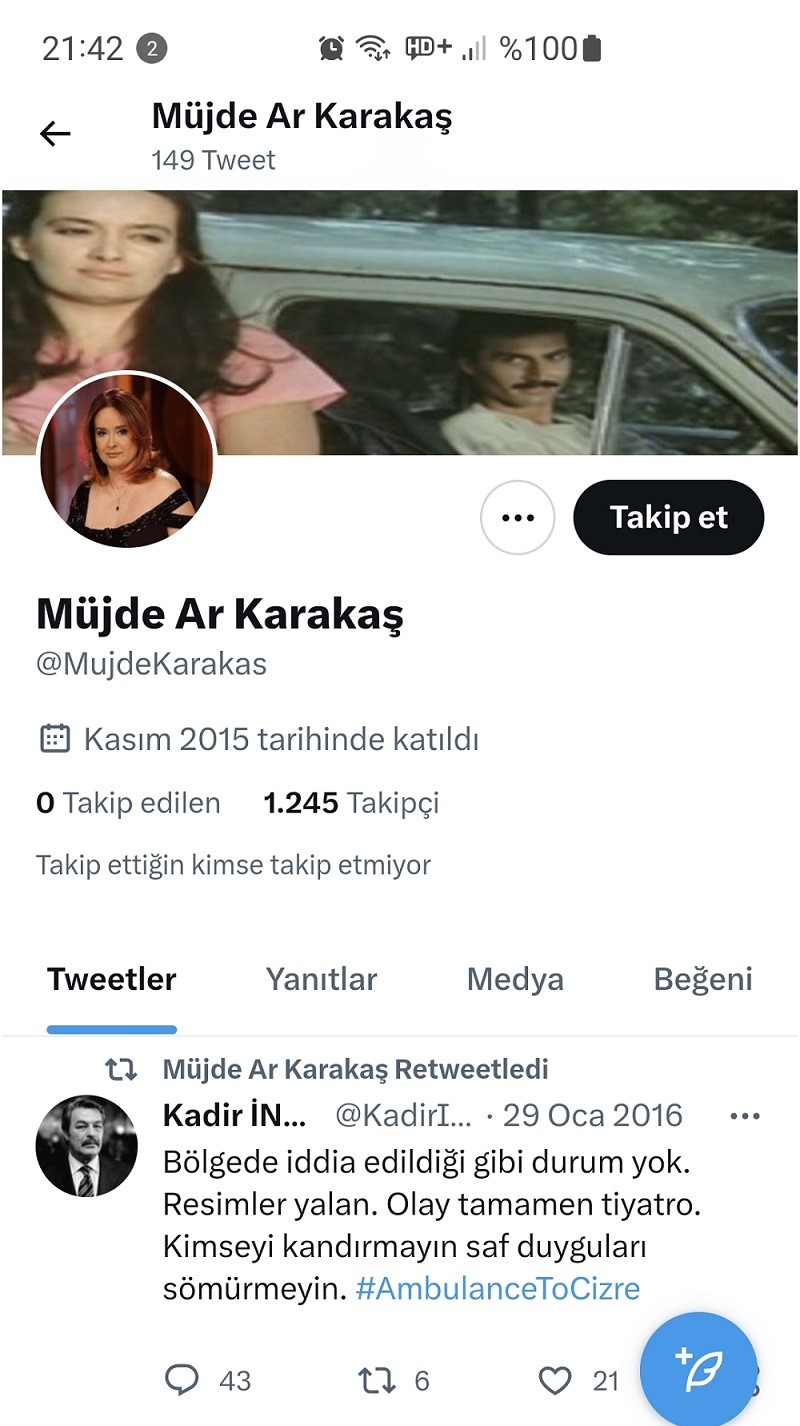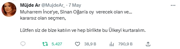 Müjde Ar; "Benim adımı kullanarak paylaşım yapanlar IP numarası tespit edilerek hukuki yollarla gereği yapılacak. Benim kesinlikle Twitter'da hesabım yok, olmayacakta, hangi hakla benim ismimi kullanıyorlar? Adalet önünde de hesap sorulacak." dedi.