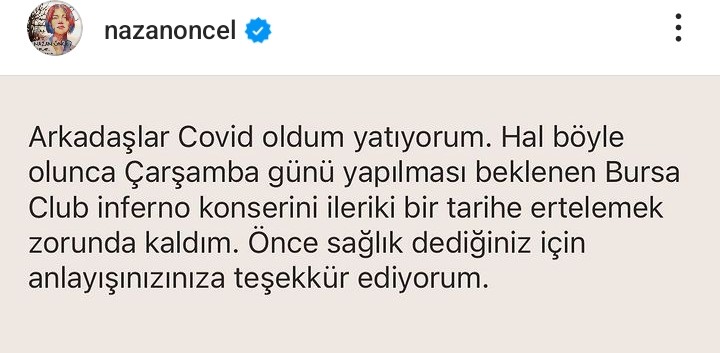 Öncel, "Arkadaşlar Covid oldum yatıyorum. Hal böyle olunca çarşamba günü yapılması beklenen Bursa Club İnferno konserini ileriki bir tarihe ertelemek zorunda kaldım" dedi.