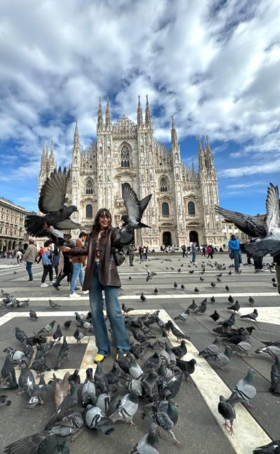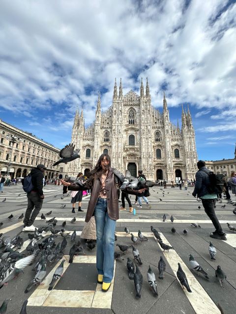 Çekimden sonra şehri gezen başarılı oyuncu, Milano’nun tarihi dokularını gezmesinin ardından Piazza del Duomo meydanında