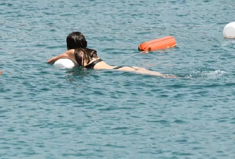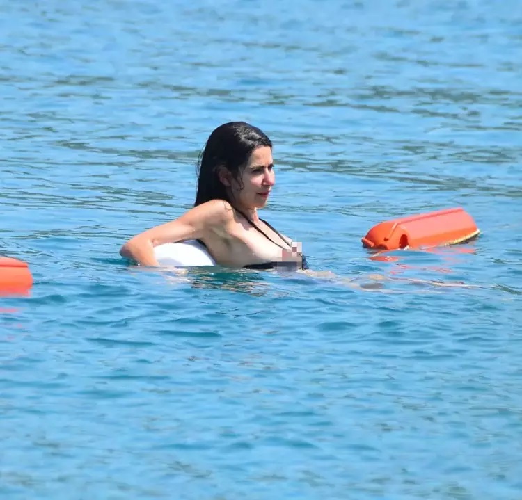 Kendisini sık sık serin sulara bırakan oyuncu, hem iskelede hem de denizde ara ara bikinisinin üstünü çıkardı.