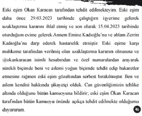 Karacan'dan iki çocuk sahibi olan Zeynep Kadıoğlu, sosyal medya hesabından yazılı bir açıklama yaparak yardım çağrısında bulundu. Can güvenliğinin olmadığını söyleyen Kadıoğlu, "Eski eşim Okan Karacan tarafından tehdit edilmekteyim. Eski eşim daha önce 29.03.2023 tarihinde çalıştığım iş yerime gelerek uzaklaştırma kararını ihlal etmiş ve son olarak 15.04.2023 tarihinde oturduğum evime gelerek annem Emine Kadıoğlu'nu ve ablam Zerrin Kadıoğlu'nu darp ederek hastanelik etmiştir. Eski eşime karşı mahkeme tarafından verilmiş olan uzaklaştırma kararım olmasına ve Okan Karacan isimli hesabından ve özel numaralardan arayarak sürekli biçimde beni ve ailemi yoğun biçimde tehdit edip hakaretler etmesine rağmen eski eşim gözaltından serbest bırakılmıştır. Ben ve ailem kendisi hakkında şikayetçi olduk. Can güvenliğimiz tehlike altında. Eski eşim Okan Karacan tarafından bütün kamuoyu önünde açıkça tehdit edilmekte olduğumu duyuyorum" dedi.