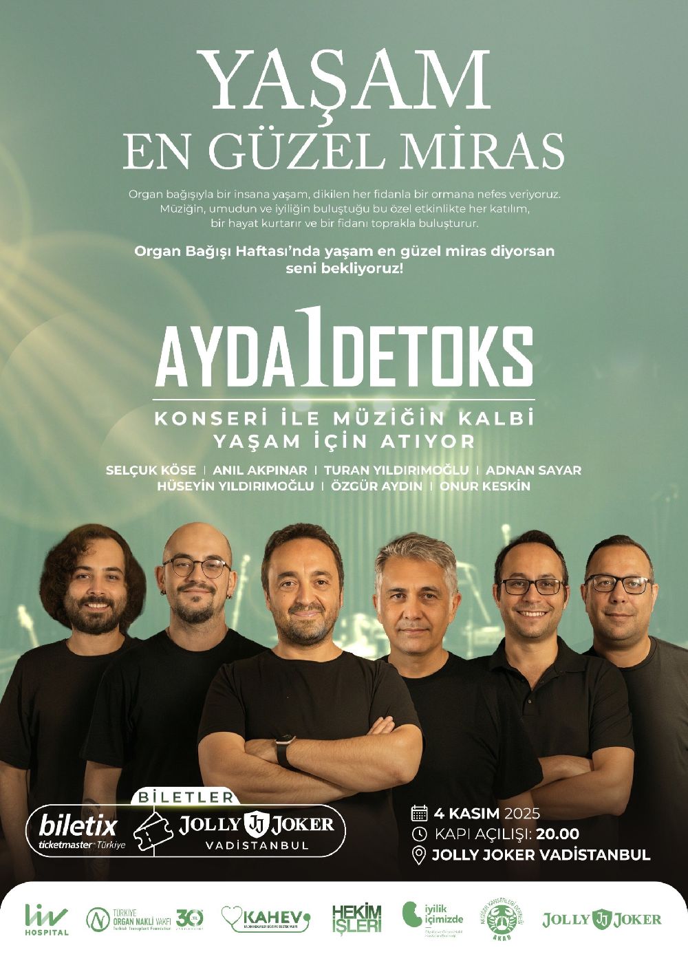Gecede ayrıca, sanatçı Sinan Güleryüz konuk olarak sahne alacak. Tülin Şahin gibi ünlü isimlerin de destek vereceği etkinlikte, müzik, umut ve iyilik bir araya gelecek. Organ bağışının önemine her konserinde dikkat çeken Ayda1Detoks, bu kez organ bağışı farkındalığı için sahnede olacak. Grubun mottosu ise her zamanki gibi anlamlı:“Bir Ayda Bir Detoks, Yılda Bir Farkındalık.”