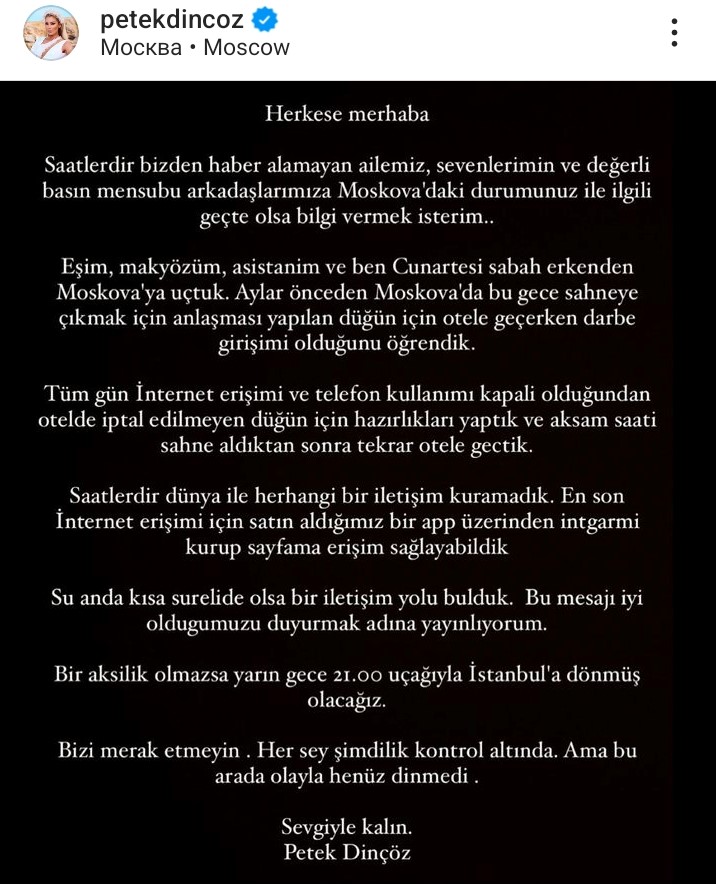 Gece yarısı açıklama yapan şarkıcı, "Eşim, makyözüm, asistanım ve ben cumartesi sabah erkenden Moskova'ya uçtuk. Aylar önceden Moskova'da bu gece sahneye çıkmak için anlaşması yapılan düğün için otele geçerken darbe girişimi olduğunu öğrendik. Tüm gün internet erişimi ve telefon kullanımı kapalı olduğundan otelde iptal edilmeyen düğün için hazırlıkları yaptık ve akşam saati sahne aldıktan sonra tekrar otele geçtik. Saatlerdir dünya ile herhangi bir iletişim kuramadık. En son internet erişimi için satın aldığımız bir app üzerinden Instagram'ı kurup sayfama erişim sağlayabildik. Şu anda kısa süreli de olsa bir iletişim yolu bulduk. Bu mesajı iyi olduğumuzu duyurmak adına yayınlıyorum. Bir aksilik olmazsa yarın gece 21.00 uçağıyla İstanbul'a dönmüş olacağız. Bizi merak etmeyin. Her şey şimdilik kontrol altında. Ama bu arada olayla henüz dinmedi. Sevgiyle kalın. Petek Dinçöz" ifadelerini kullandı.