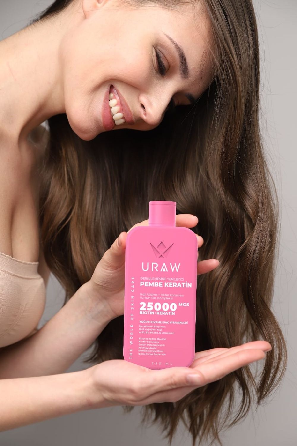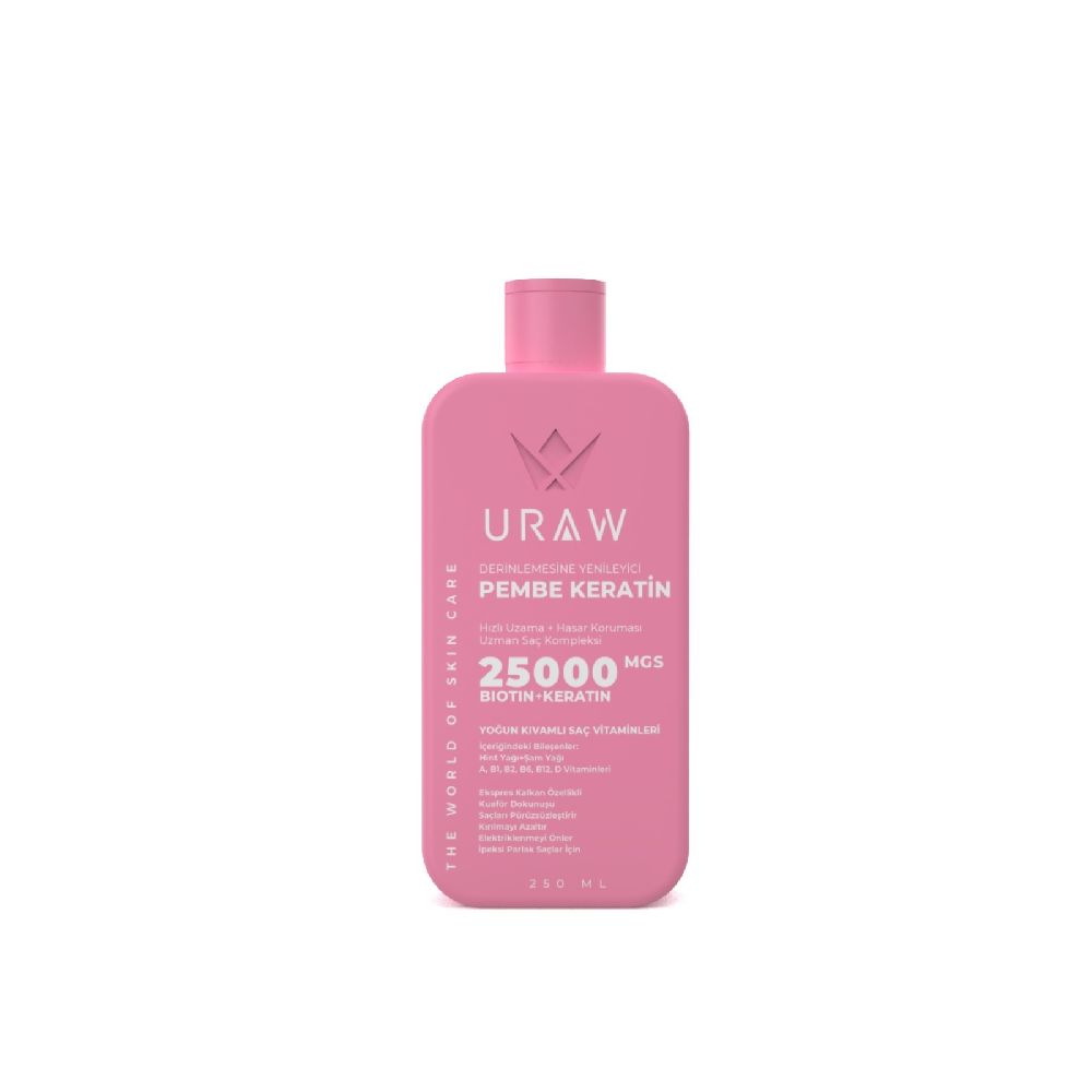 "Uraw Candy Hyaluranic Acıd Ceramid" Pink Keratin saçınızın ihtiyaç duyduğu besleyici bakımı sağlar. Saçlarınıza derinlemesine nüfuz eder, güçlendirir, yumuşatır ve parlaklık kazandırır. İçeriğindeki keratin, hint yağı, şam yağı ve özel bileşenler sayesinde saç tellerini besler ve yeniden yapılandırır. Zayıflamış, yıpranmış veya kırılgan saçlar için ideal olan bu ürün, saçların güçlenmesine ve daha sağlıklı bir görünüm kazanmasına yardımcı olur. Ayrıca, içeriğinde bulunan B1, B2, B6, B12, D ve E vitaminleri ile saçlarınızı derinlemesine besler. Saç derisini de rahatlatır ve nemlendirir. Elektriklenmeyi önleyici özelliği sayesinde saçlarınız daha düzgün ve kontrol altında olur.