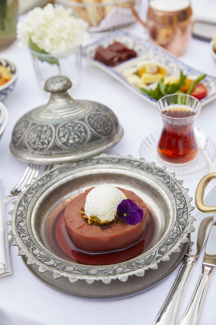 Otelin kuş sesleriyle çevrelenen ferah avlusunda, Ramazan ayına özel olarak dekore edilen Avlu Restaurant’ta, Executive Chef Özgür Üstün ve ekibinin özenle hazırladığı 5 seçenekli iftar menüsünde günün leziz çorbasının ardından odun fırınında gözleme, pide, tandır ekmeği gibi mükemmel lezzetler paylaşımlık olarak sunuluyor. Ardından servis edilen Osmanlı saray şerbeti, kızılcık, demirhindi ve reyhan gibi serin şerbetler ana yemeğe ferah bir geçiş yaratıyor. Ana yemek seçeneklerinde “Ağır Ateşte Pişmiş Kuzu İncik”, “Yoğurtlu Kebap”, “Izgara Dana Şaşlık”, “Fener Balığı Kavurma”, “Çökertme Kebabı” gibi enfes lezzetlere; “Ballı Mahmudiye”, Şiveydiz’’, ‘’Kuzu Güveç”, Terkib-i Çeşidiye’’ gibi iştah açıcı lezzetler eşlik ediyor. Sebze yemekleri ve bakliyatlardan oluşan zengin lezzetler de farklı damak tatlarına alternatif yaratıyor. La Pistache’nin özenle hazırladığı tatlı büfesi ise zengin çeşitleriyle baş döndürücü güzellikte. Büfede; güllaçtan, fırın sütlaca, şekerpareden, vişneli ekmek kadayıfı, zerde ve baklava çeşitlerine pek çok geleneksel tat yer alıyor.