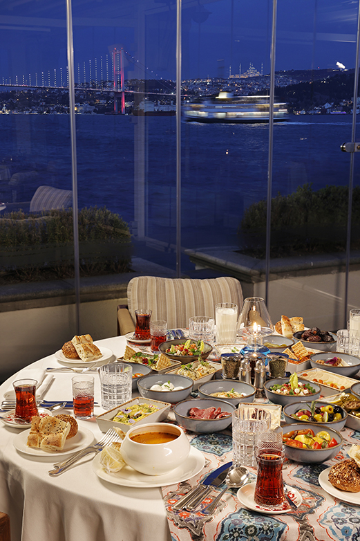 İstanbul Boğazı’nın kıyısında, benzersiz konumuyla Four Seasons Hotel Bosphorus, misafirlerini iftar sofralarında klasik haline gelen açık büfesi ile buluşturuyor. Türk Sanat Müziğinin ezgileri eşliğinde açık büfede lezzetli iftariyeliklerden, Ege, Akdeniz ve Güneydoğu Anadolu’nun zengin mezelerine, etli bamya, kuru patlıcan dolması ve içli köfteden serin şerbetlere kadar iştah açıcı seçenekler yer alıyor. Geleneksel kebap çeşitleri, et döner, dana gerdanlı keşkek, kuzu ve dana etinden ızgara çeşitleri ve odun fırınında hazırlanan pide çeşitleri de damaklarda iz bırakıyor.
