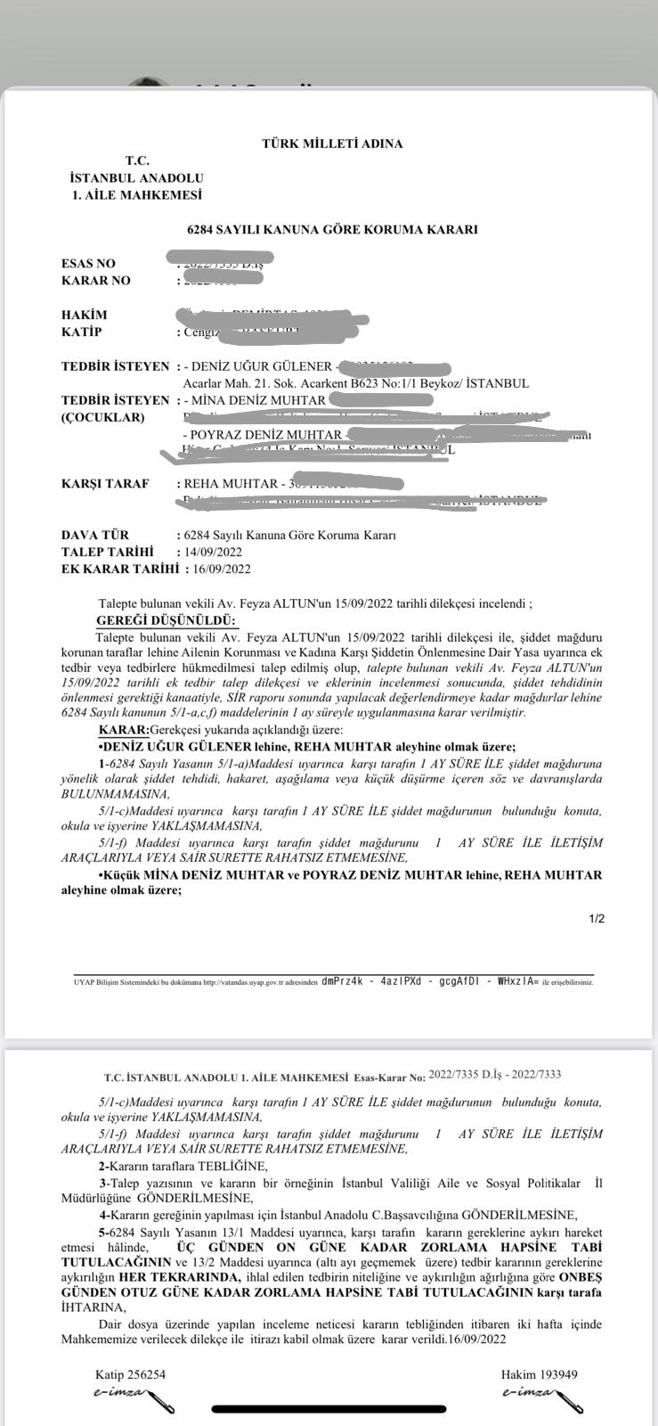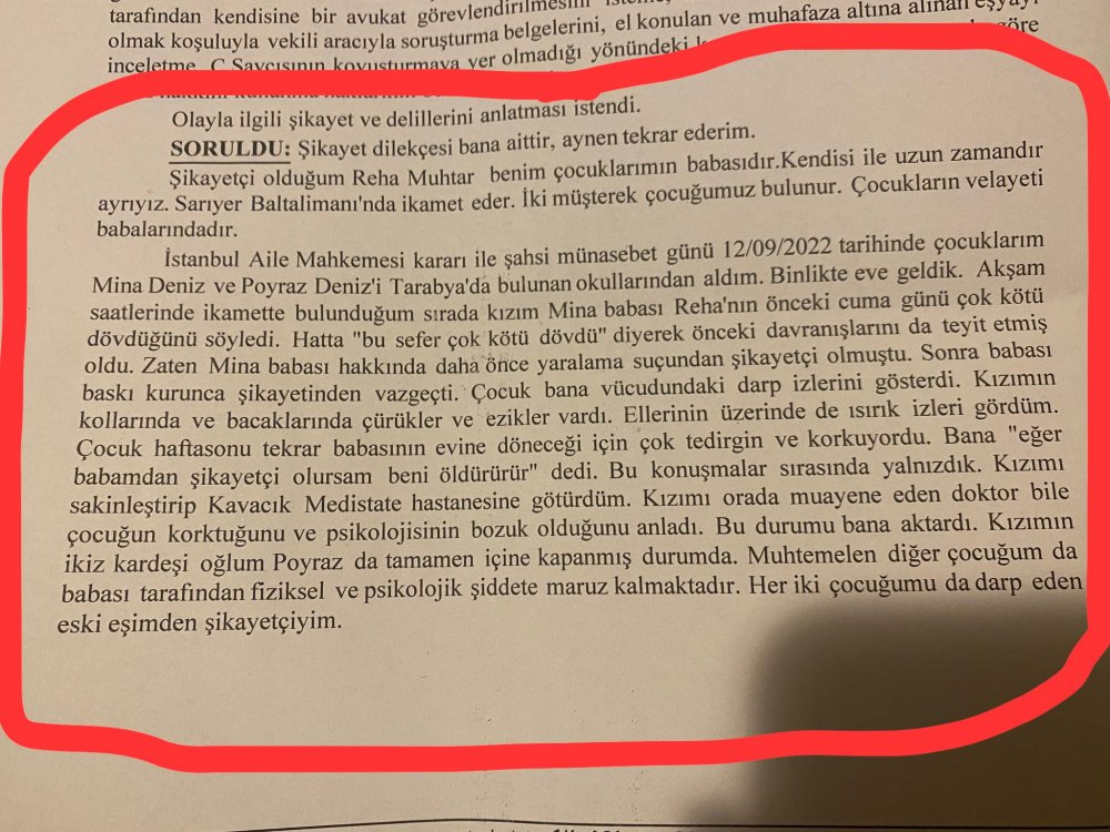 “Şikâyetçi olduğum Reha Muhtar benim çocuklarımın babasıdır. Kendisiyle uzun zamandır ayrıyız. 2 müşterek çocuğumuz bulunur. Çocukların velayeti babalarındadır. İstanbul Aile Mahkemesi kararıyla şahsi münasebet günü 12.09.2022 tarihinde çocuklarım Mina Deniz ve Poyraz Deniz’i Tarabya’da bulunan okullarından aldım.