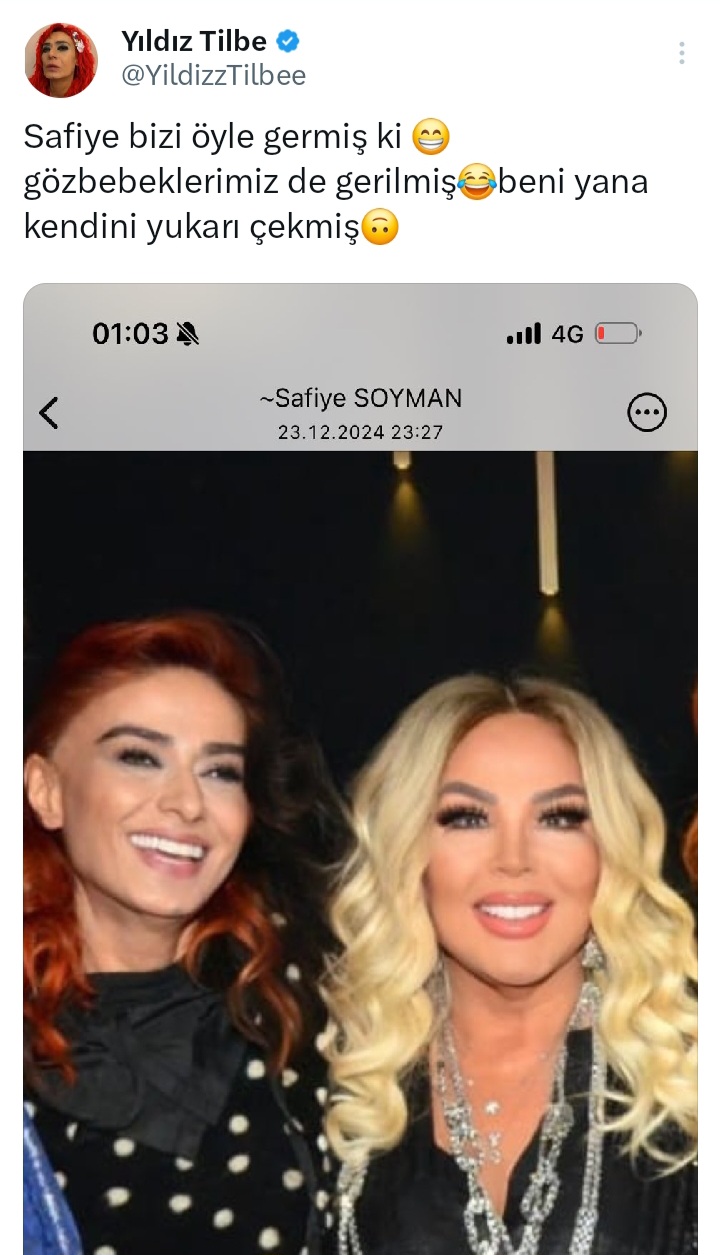 Tilbe, "Safiye bizi öyle germiş ki! Gözbebeklerimiz de gerilmiş. Beni yana kendini yukarı çekmiş" dedi.