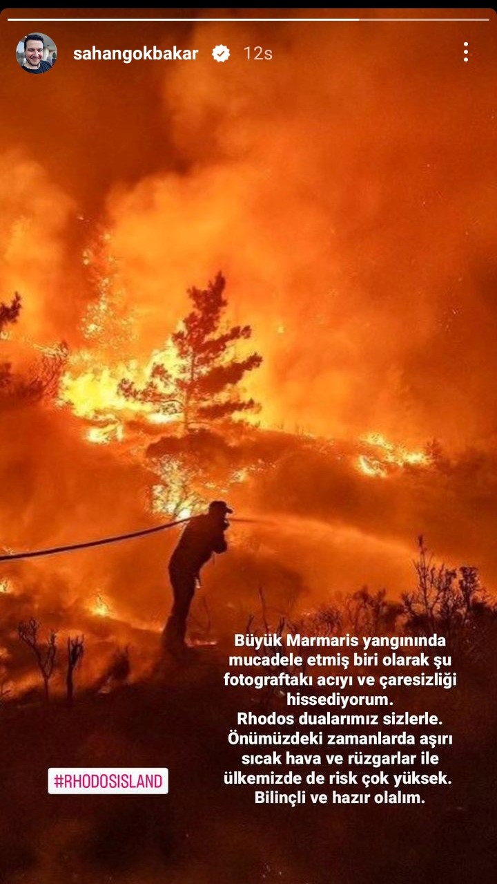 Gökbakar, "Büyük Marmaris yangınında mücadele etmiş biri olarak şu fotoğraftaki acıyı ve çaresizliği hissediyorum. Rhodos dualarımız sizlerle... Önümüzdeki zamanlarda aşırı sıcak hava ve rüzgarlar ile ülkemizde de risk çok yüksek. Bilinçli ve hazır olalım" dedi.