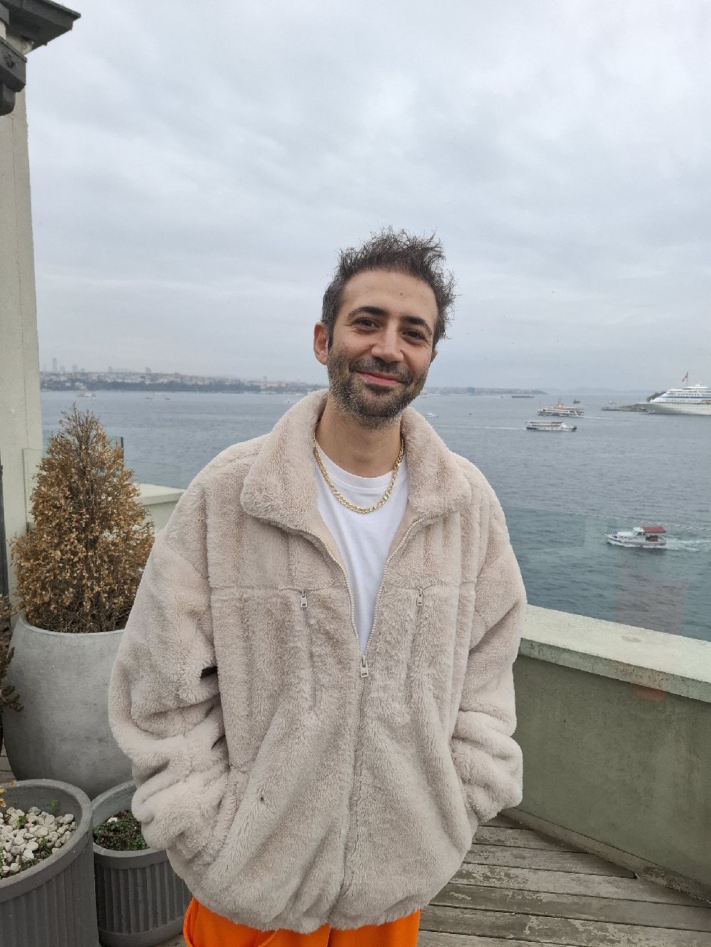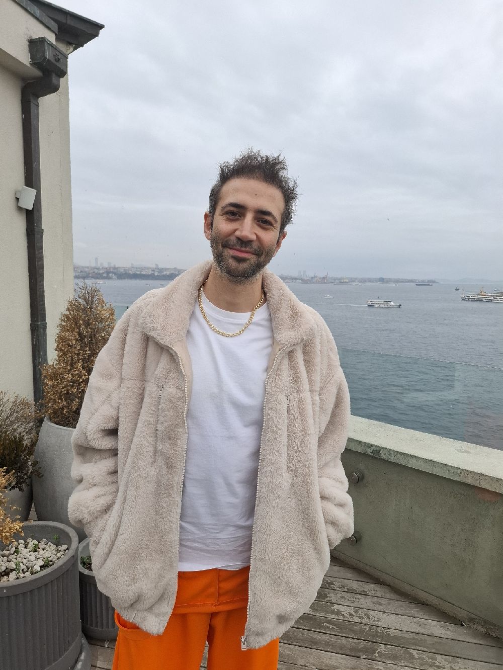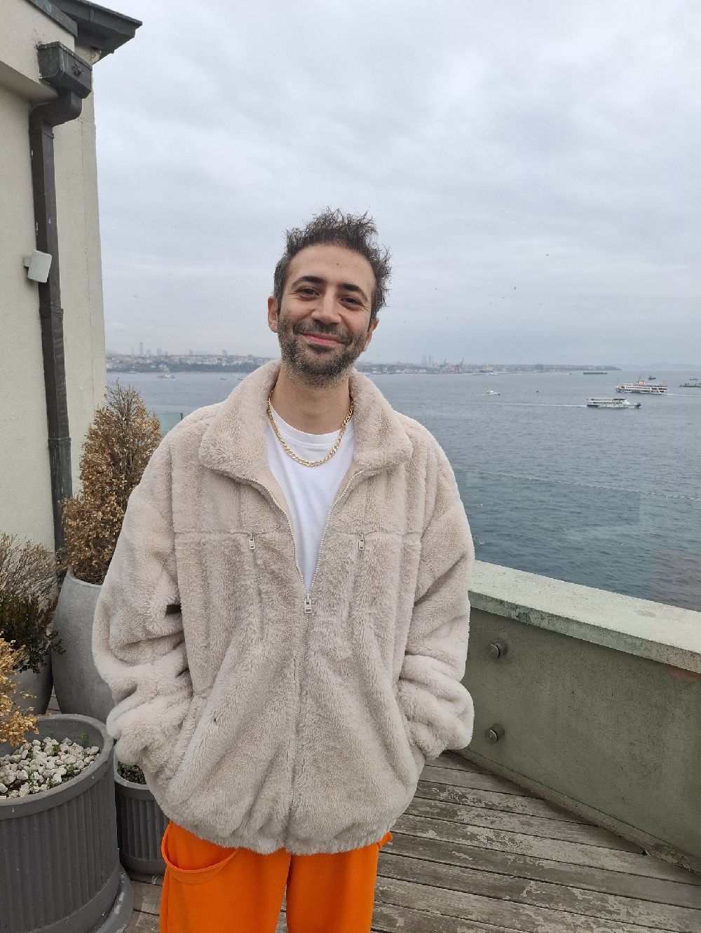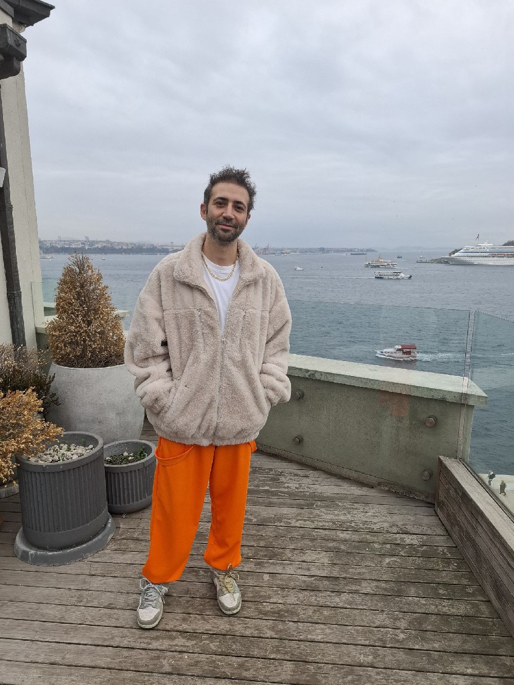 Dünya Varmış filminin senaristi ve başrol oyuncusu Sarp Bozkurt, pelüş montu ve turuncu pantolonuyla adeta göz kamaştırdı.