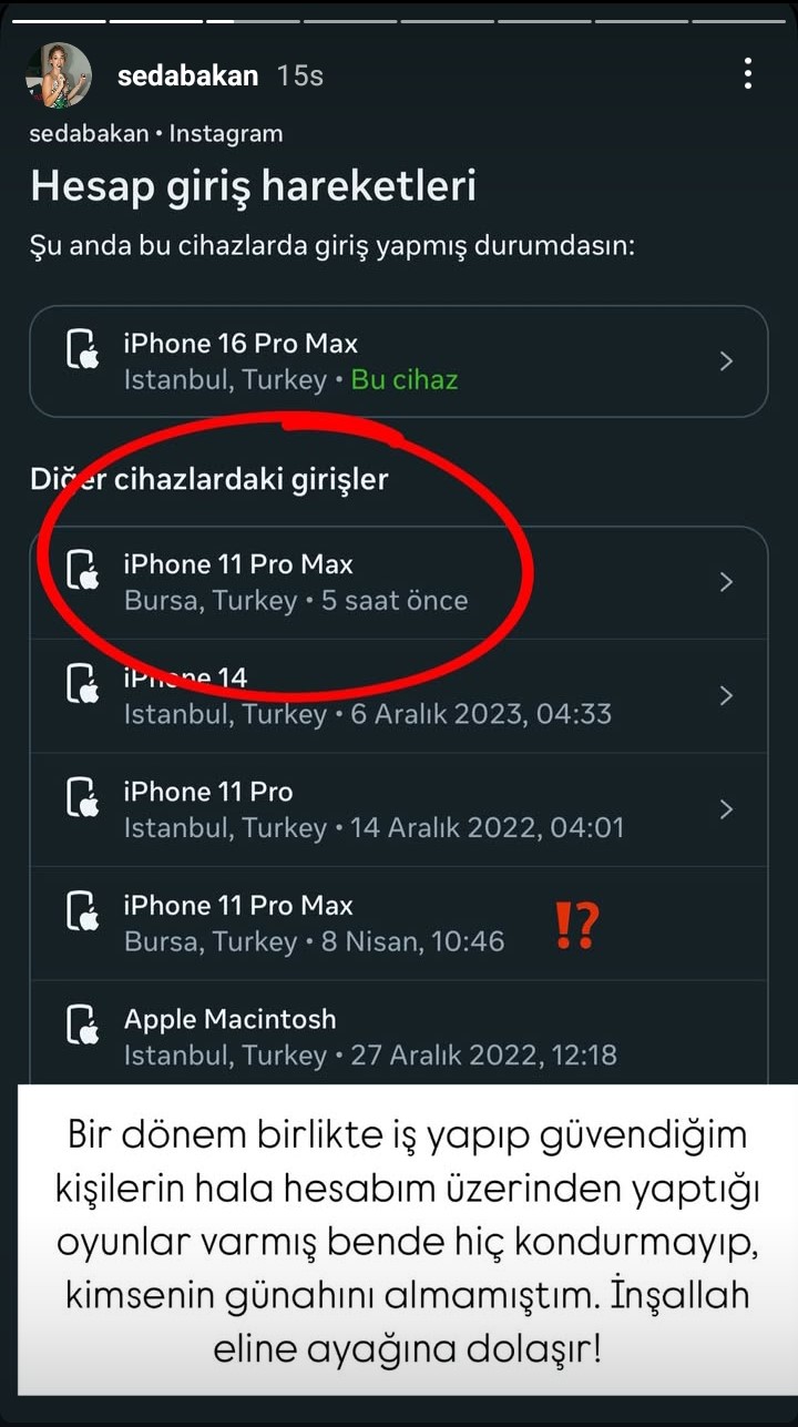 Bakan, Instagram hesabına birilerinin girdiğini açıkladı. Bir ekran görüntüsü paylaşan oyuncu, "Bir dönem birlikte iş yapıp güvendiğim kişilerin hala hesabım üzerinden yaptığı oyunlar varmış, ben de hiç konduramayıp, kimsenin günahını almamıştım. İnşallah elin ayağına dolaşır!" dedi. Bakan'ın işaretlediği iPhone 11 olması dikkat çekti. Geçtiğimiz günlerde Hadise'nin ayna paylaşımında iPhone 11 kullandığı görülmüştü.