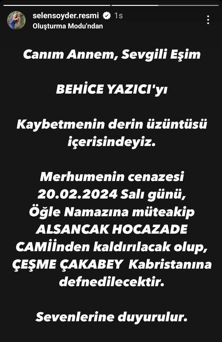 Selen Soyder'in annesi Behice Yazıcı hayatını kaybetti.