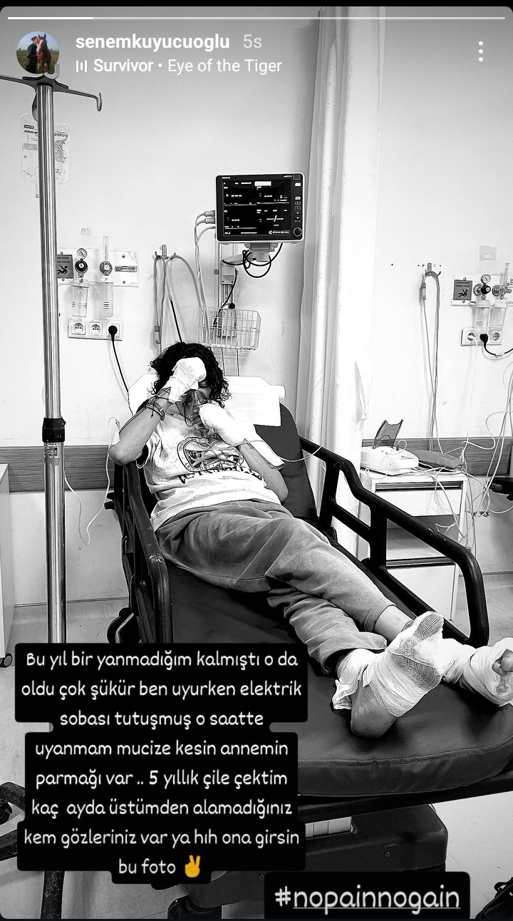 Hastanede tedavi gören Senem Kuyucuoğlu, "Bu yıl, bir yanmadığım kalmıştı o da oldu, çok şükür. Ben uyurken elektrik sobası tutuşmuş... O saatte uyanmam mucize" diyerek, hastane fotoğrafını paylaştı.