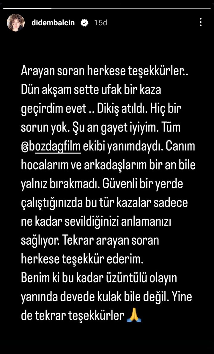 Balçın, Instagram'dan açıklama yaptı. Oyuncu, "Dikiş atıldı. Hiçbir sorun yok, şu an gayet iyiyim" dedi.