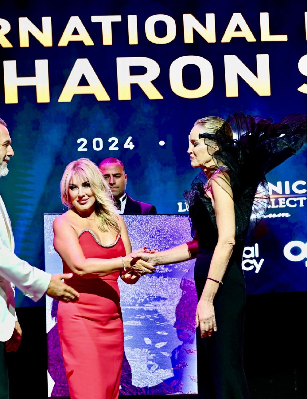 Törende Gaye Donay ve Sharon Stone, sahnede zafer işareti yaparak sanatın birleştirici ve iyileştirici gücünü simgeleyen iki güçlü kadın olarak dikkat çekti.