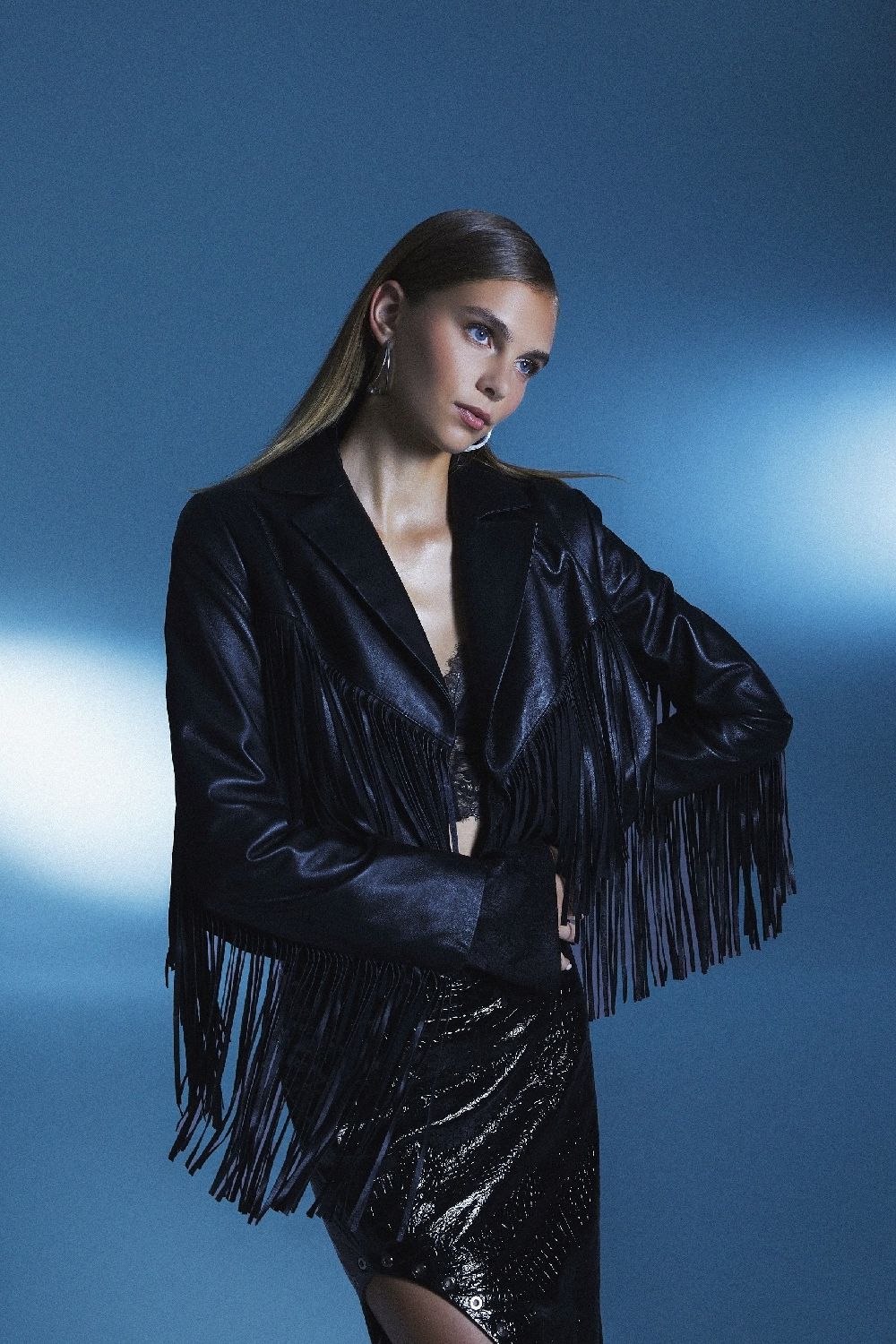 Daniela Deri Ceket, bel çizgisinde biten kalıbı ve yüksek yaka detaylarıyla ön plana çıkıyor. Siyah olarak üretilen Daniela Ceket’in sırtını ve kollarını takip eden uzun püskül detayı 2000’lerin eğlenceli günlerine göz kırpıyor. Clara Deri Etek, yüksek beli ve derin yırtmacıyla öne çıkıyor.