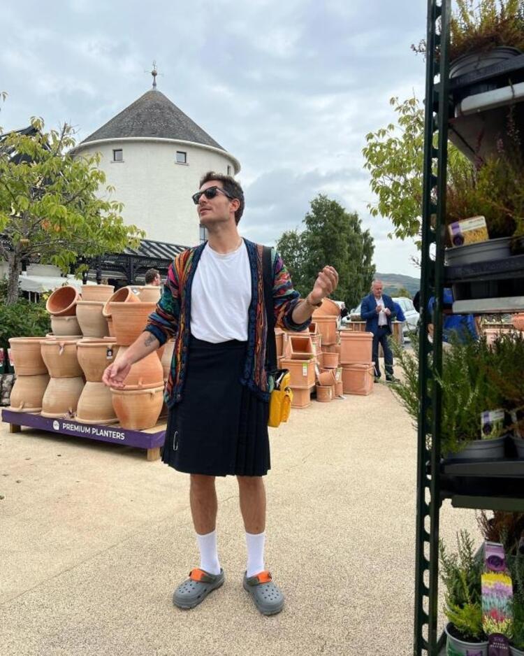 İskoçya'ya giden Kaygılaroğlu, İskoç erkeklerinin giydiği 'kilt' ismi verilen etekle poz verdi.
