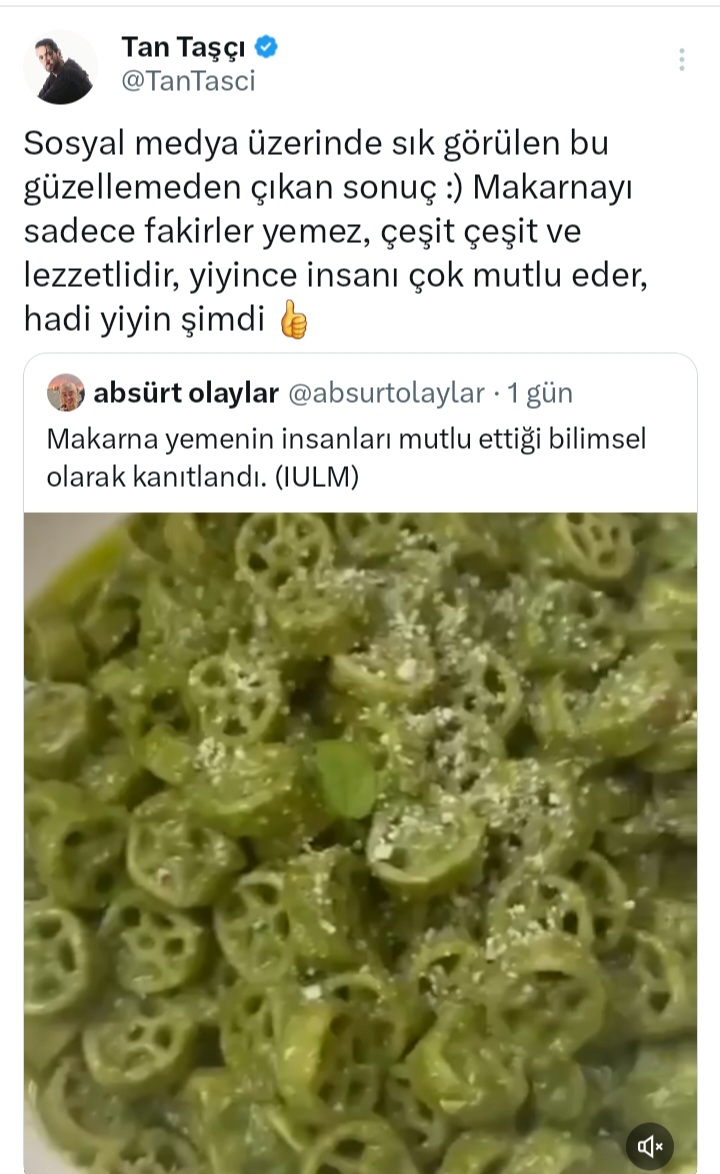 Bir Twitter adresinin, "Makarna yemenin insanları mutlu ettiği bilimsel olarak kanıtlandı" diye tweet attı.