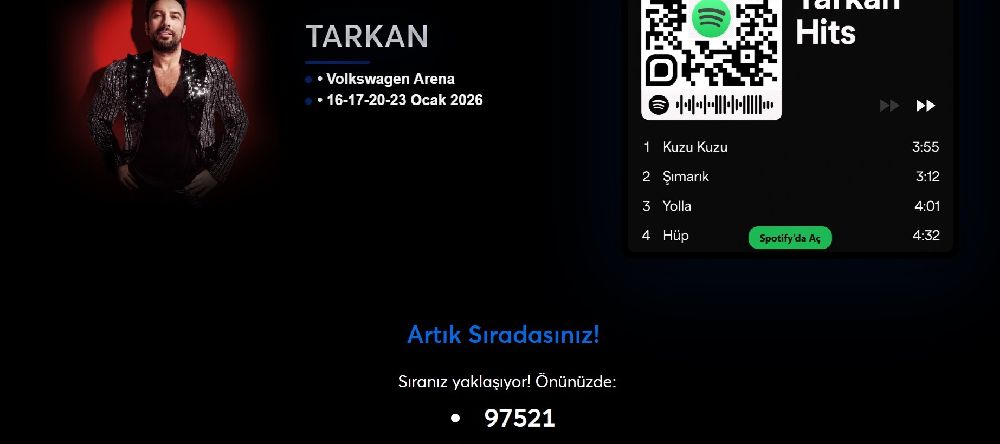 Bilet satan internet sitesi ise bilet almak isteyenleri ise sıraya soktu. 97 bin 521 kişinin bilet almak için sıra beklediği görüldü. Bilet sitesi, Tarkan bileti satın almak isteyen vatandaşları beklerken megastarın şarkılarına yer verdi.
