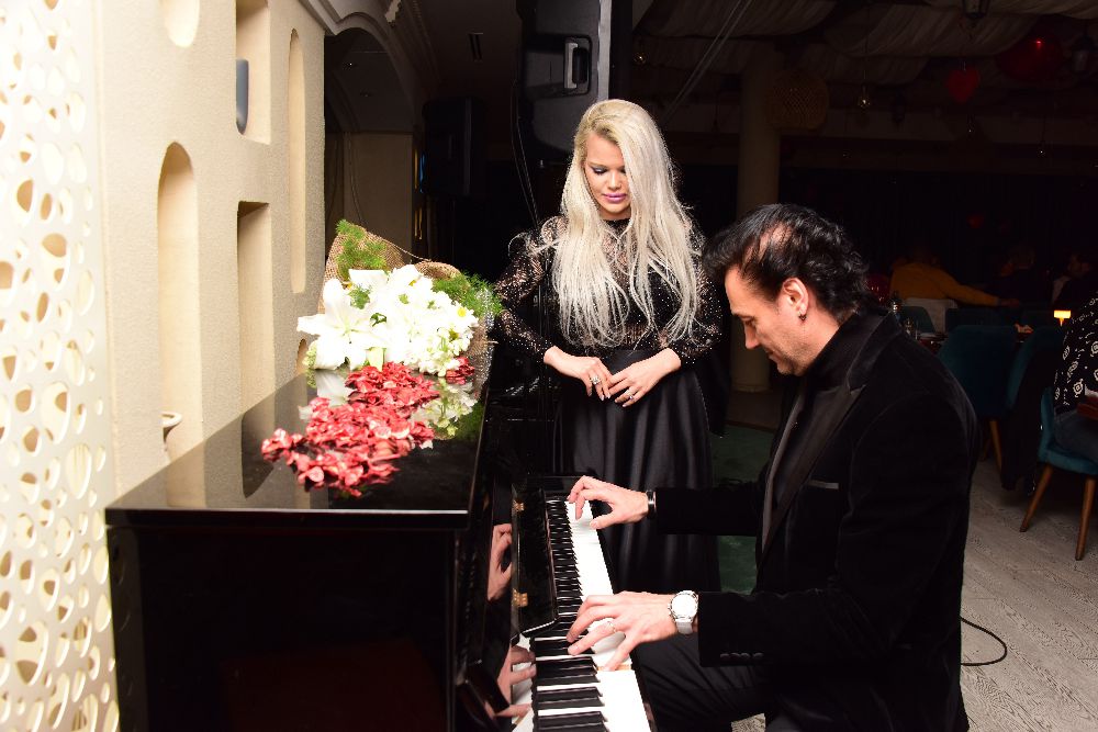 Ünlü sanatçı, yoğun istek üzerine piyanonun başına geçti ve eşinin gözlerinin içine bakarak duygusal bir performans sergiledi. Kendi bestesi olan "Kar Beyazdır Ölüm" ve Gökhan Kırdar'ın "Yerine Sevemem" şarkısını seslendirdi. Salonun atmosferi bu duygusal performansla daha da yoğunlaşırken, çiftin birbirlerine olan sevgi dolu bakışları etrafındakileri de etkiledi.