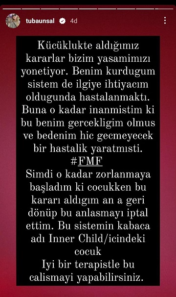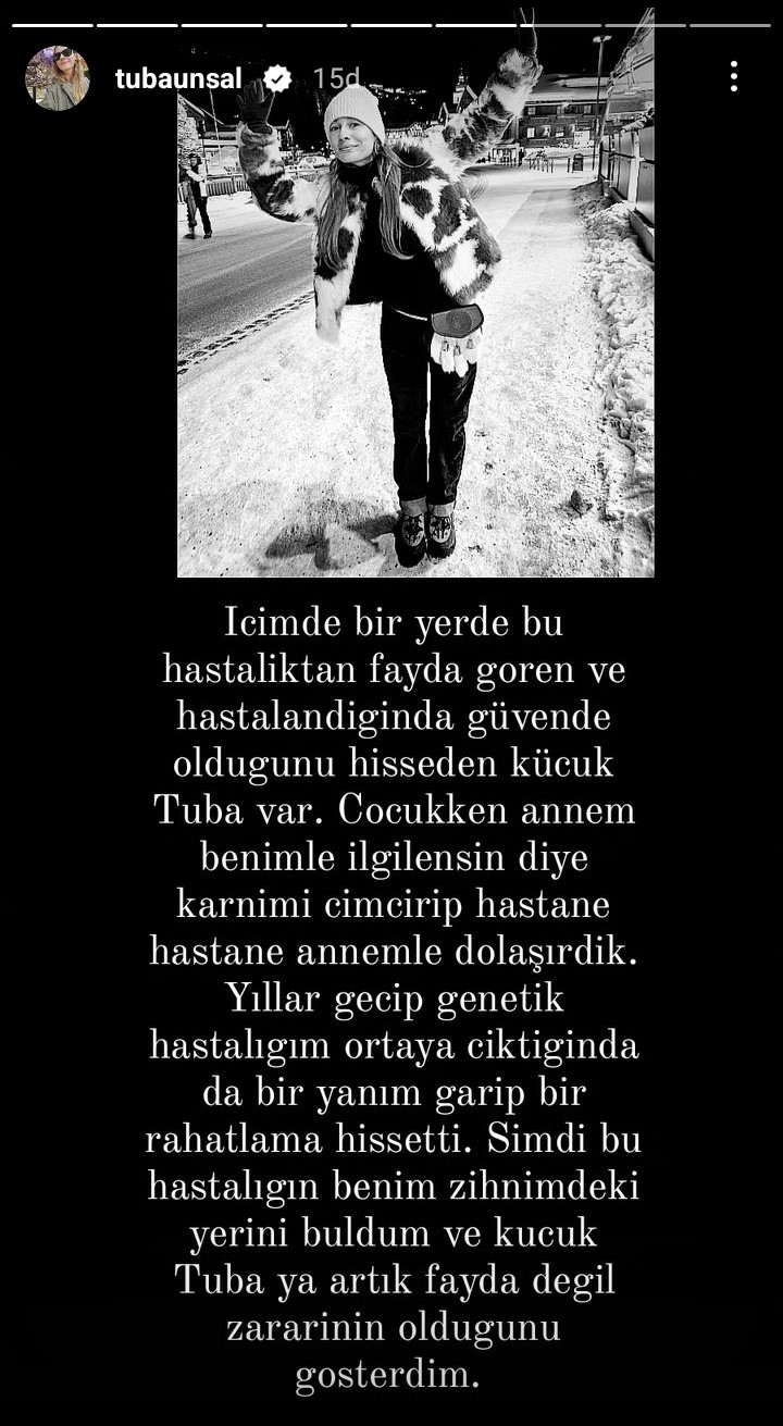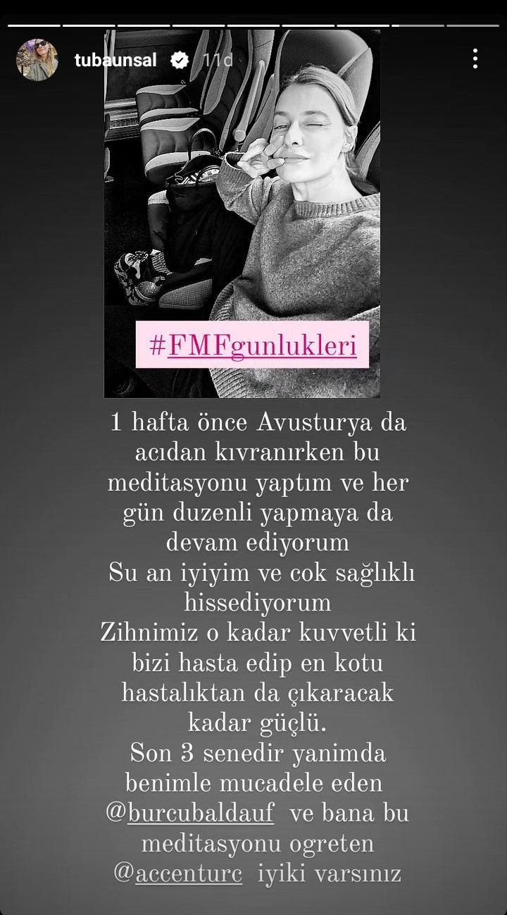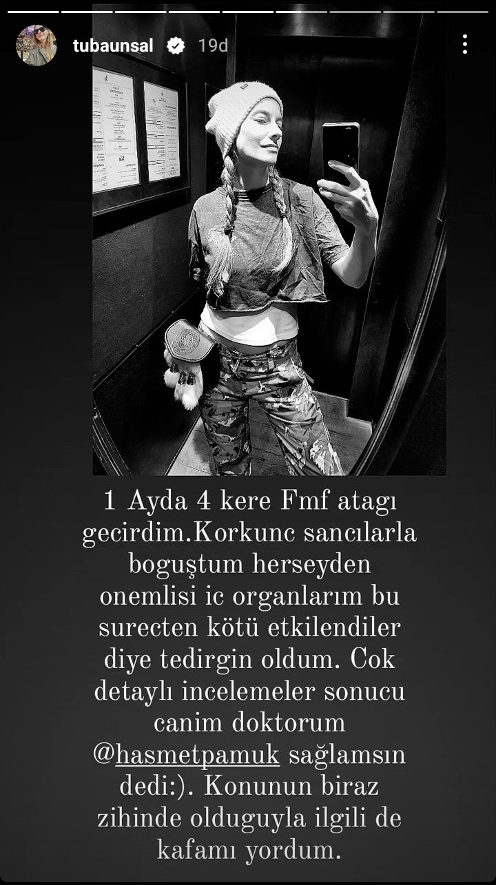 Tuba Ünsal, bir ayda FMF atağı (Familial Mediterranean Fever yani FMF olarak da bilinen ailevi akdeniz ateşi, göğüs, karın ya da eklemlere tekrarlayan ağrılı bir şekilde görülen inflamasyon ataklarıdır. Kalıtsal olarak anne ve babadan geçen FMF hastalığı, atak olarak ortaya çıkarak döküntü, bağ ağrısı ve ateş gibi belirtilerle görülür) geçirdiğini söyledi.