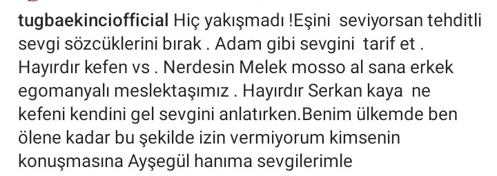 Tuğba Ekinci, Kaya'nın açıklamalarına sert tepki gösterdi. Ekinci, "Hiç yakışmadı! Eşini seviyorsan tehditli sevgi sözcüklerini bırak. Adam gibi sevgini tarif et. Hayırdır kefen vs... Neredesin Melek Mosso al sana erkek egomanyalı meslektaşımız. Hayırdır Serkan Kaya ne kefeni kendini gel sevgini anlatırken. Benim ülkemde ben ölene kadar bu şekilde izin vermiyorum kimsenin konuşmasına Ayşegül Hanım'a sevgilerimle" dedi.