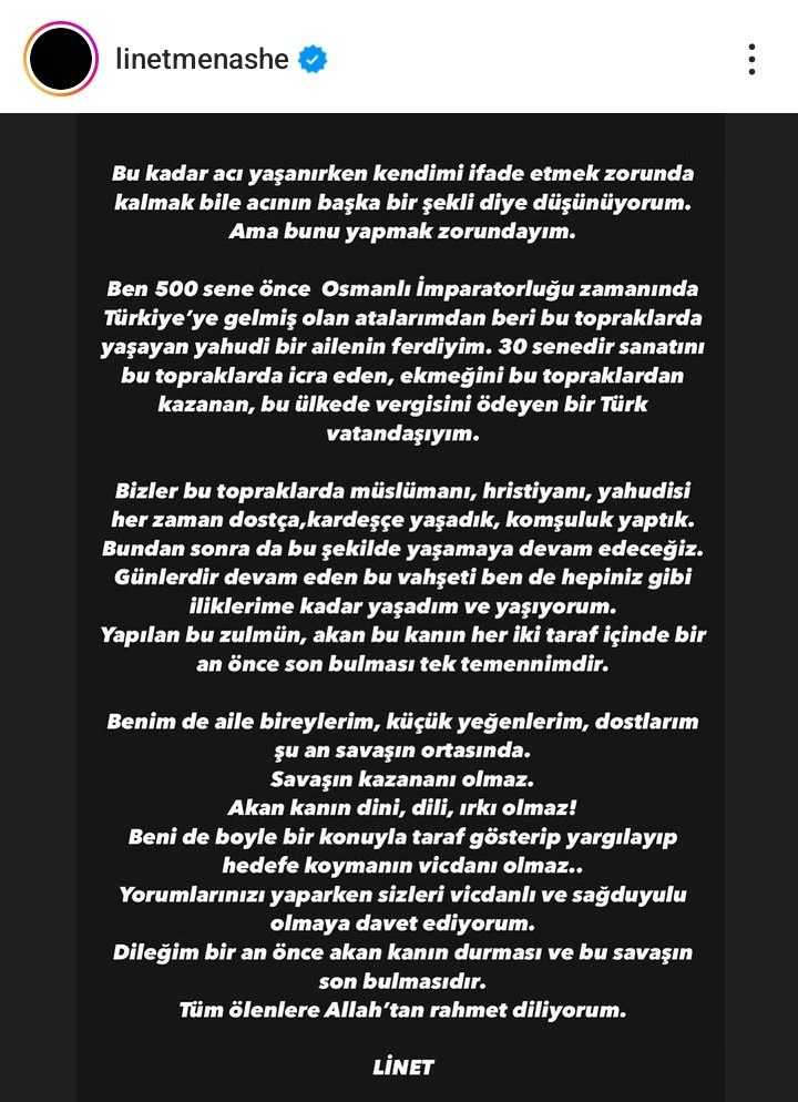 Linet, "Bu kadar acı yaşanırken kendimi ifade etmek zorunda kalmak bile acının başka bir şekli diye düşünüyorum. Ama bunu yapmak zorundayım. Ben 500 sene önce daha Osmanlı İmparatorluğu zamanında Türkiye’ye gelmiş olan atalarımdan beri bu topraklarda yaşayan yahudi bir ailenin ferdiyim. 30 senedir sanatını bu topraklarda icra eden, ekmeğini bu topraklardan kazanan, bu ülkede vergisini ödeyen bir Türk vatandaşıyım. Bizler bu topraklarda müslümanı, hristiyanı, yahudisi her zaman dostça,kardeşçe yaşadık, komşuluk yaptık. Bundan sonra da bu şekilde yaşamaya devam edeceğiz. Günlerdir devam eden bu vahşeti ben de hepiniz gibi iliklerime kadar yaşadım ve yaşıyorum. Yapılan bu zulmün, akan bu kanın her iki taraf içinde bir an önce son bulması tek temennimdir.