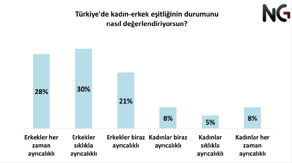 Katılımcıların %28’i erkeklerin her zaman ayrıcalıklı olduğunu düşünürken, %8’i ise kadınların her zaman ayrıcalıklı olduğunu düşünüyor.