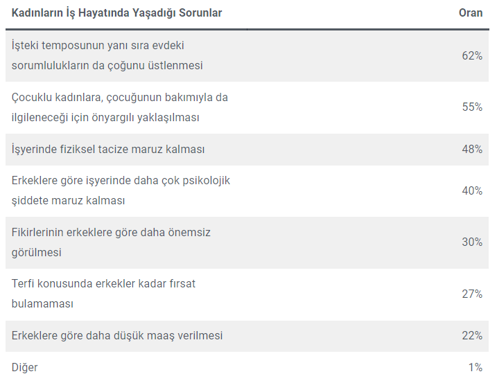 Katılımcıların %37’sine göre kadınların iş hayatında yaşadığı en büyük zorluk, işyerindeki temponun yanı sıra ev işlerinin de sorumluluğunu üstlenmesi. %16’sı ise çocuklu kadınlara çocuğuyla ilgileneceği için ön yargılı yaklaşılmasının 2. en önemli sorun olduğunu belirtti. 3. sırada gelen sorun ise %15’lik oranıyla kadınların iş hayatında fiziksel tacize maruz kalmaları oldu.