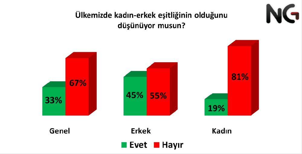 Bu soruya verilen cevapları detaylı analiz ettiğimizde ise, kadınların ve erkeklerin bu konudaki fikirlerinin ne kadar farklı olduğu ortaya çıkıyor. Kadınların %81’i ülkemizde eşitlik olmadığını düşünürken, erkeklerin ise bu oran %55’e kadar geriliyor.