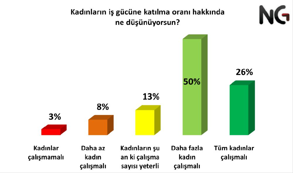 Türkiye’de kadınların iş gücüne katılım oranı son yıllarda artış gösterse de hala dünya ortalamasının oldukça gerisinde. Ankete katılanların yarısı daha fazla kadının çalışması gerektiğini düşünürken, %26’sı ise tüm kadınların çalışması gerektiğini savunuyor.
