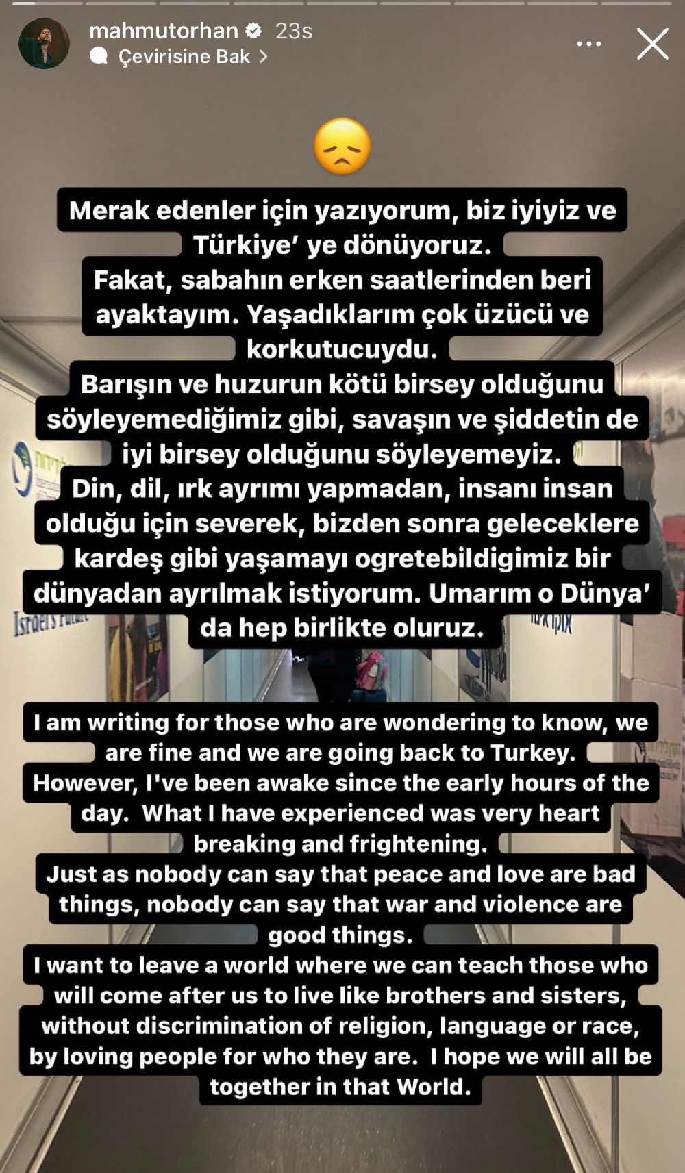Konser için İsrail'e giden DJ Mahmut Orhan, "Merak edenler için yazıyorum, biz iyiyiz ve Türkiye’ye dönüyoruz. Fakat, sabahın erken erken saatlerinden beri ayaktayım. Yaşadıklarım çok üzücü ve korkutucuydu. Barışın ve huzurun kötü bir şey olduğunu söyleyemediğimiz gibi savaşın ve şiddetin de iyi bir şey olduğunu söyleyemeyiz. Din, dil, ırk ayrımı yapmadan, insanı insan olduğu için severek,