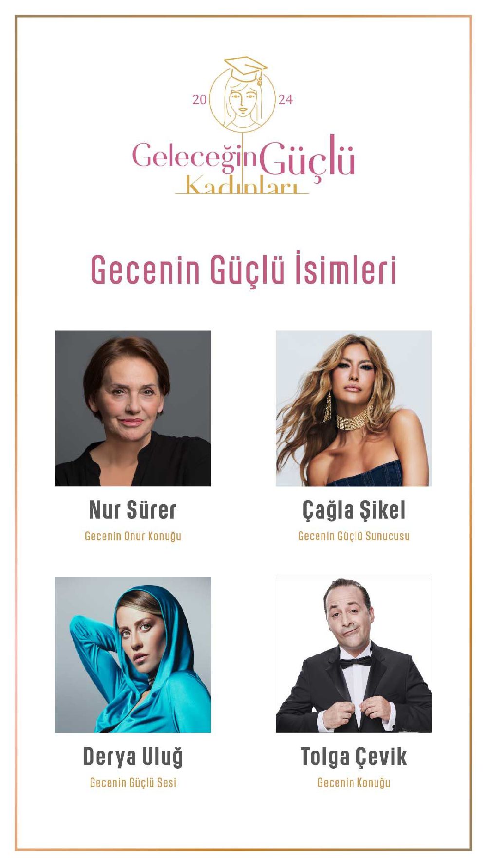 Gecenin sunuculuğunu Çağla Şikel üstlenirken, bu özel gece için üretilen tasarımlar Tolga Çevik tarafından açık artırma ile satışa sunulacak. Elde edilen gelir Toplum Gönüllüleri burs fonuna aktarılacak ve yüzlerce genç kadına umut ışığı olacak.