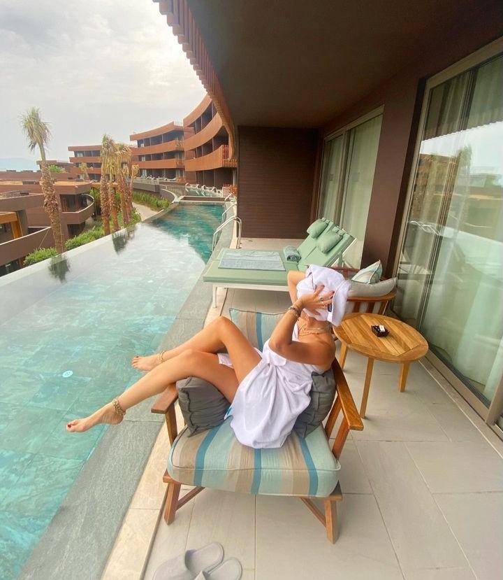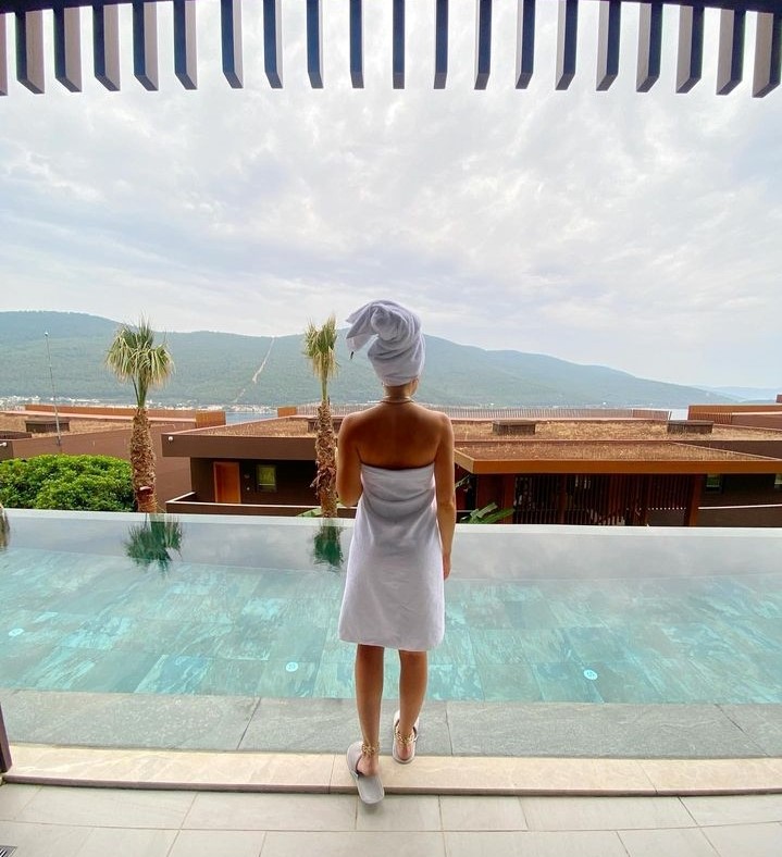 Oyuncunun, havuz başında bornozlu paylaşımı ise dikkat çekti.