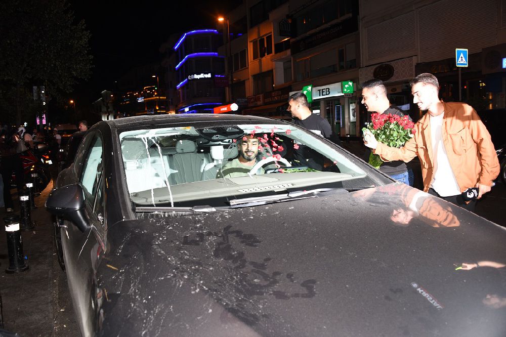 Çiçekçilerin kendisini görmesiyle arabanın önüne geçerek güller dökmeleri herkesi güldürdü.