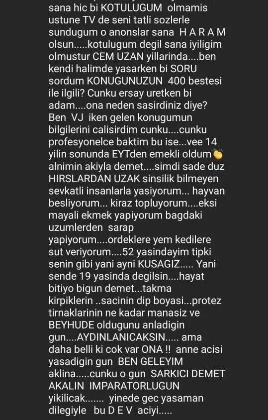 "Çünkü artık işleri tutmayan eski popüleritesi olmayan sensin. Ben kendi tercihimle İstanbul'dan taşındım anneciğim hastaydı köye taşındım. Sonra annemi kaybettim. Ben sevdiğimi toprağa koymuş insanım sen beni üzemezsin. Senin benim için söylediklerin bana acı vermez. Kin ve nefret dolusun. Senin tatile çağırıp plajda mum ettiğin Doğancan değilim ya da çantanı taşımada yardım istediğin Esra hiç değilim... Kral TV günlerini hatırlatırım. Beni arayıp CD ve kaset sorguladığın o yılları. Sana hiç bir kötülüğüm olmamış üstelik TV'de seni tatlı sözlerle sunduğum anonslar haram olsun... 52 yaşındayım tıpkı senin gibi aynı kuşağız. Yani sende 19 yaşında değilsin. Hayat bitiyor Demet takma kirpiklerin, saçının dip boyası, protez tırnaklarının ne kadar manasız ve beyhude olduğunu anladığın gün aydınlanacaksın...