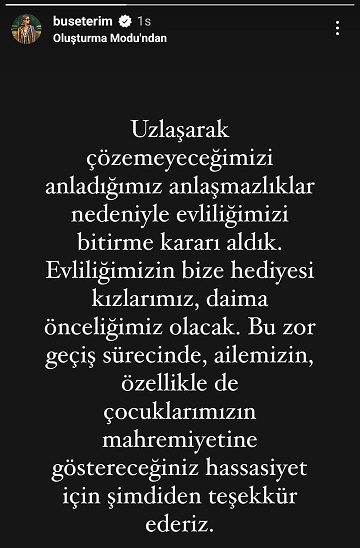 Buse Terim, "Uzlaşarak çözemeyeceğimizi anladığımız evliliğimizi bitirme kararı aldık" dedi.