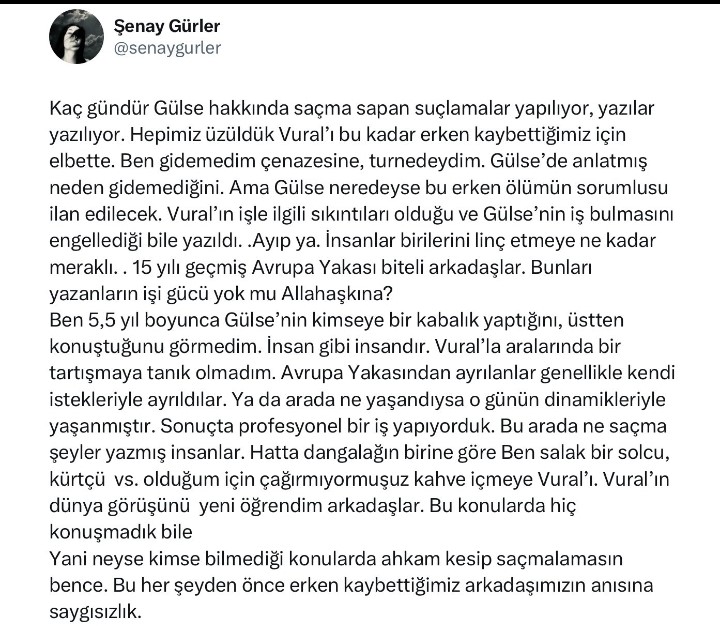 Gürler, "Kaç gündür Gülse hakkında saçma sapan suçlamalar yapılıyor, yazılar yazılıyor. Hepimiz üzüldük Vural'ı bu kadar erken kaybettiğimiz için elbette. Ben gidemedim cenazesine, turnedeydim. Gülse de anlatmış neden gidemediğini. Ama Gülse neredeyse bu erken ölümün sorumlusu ilan edilecek" dedi.