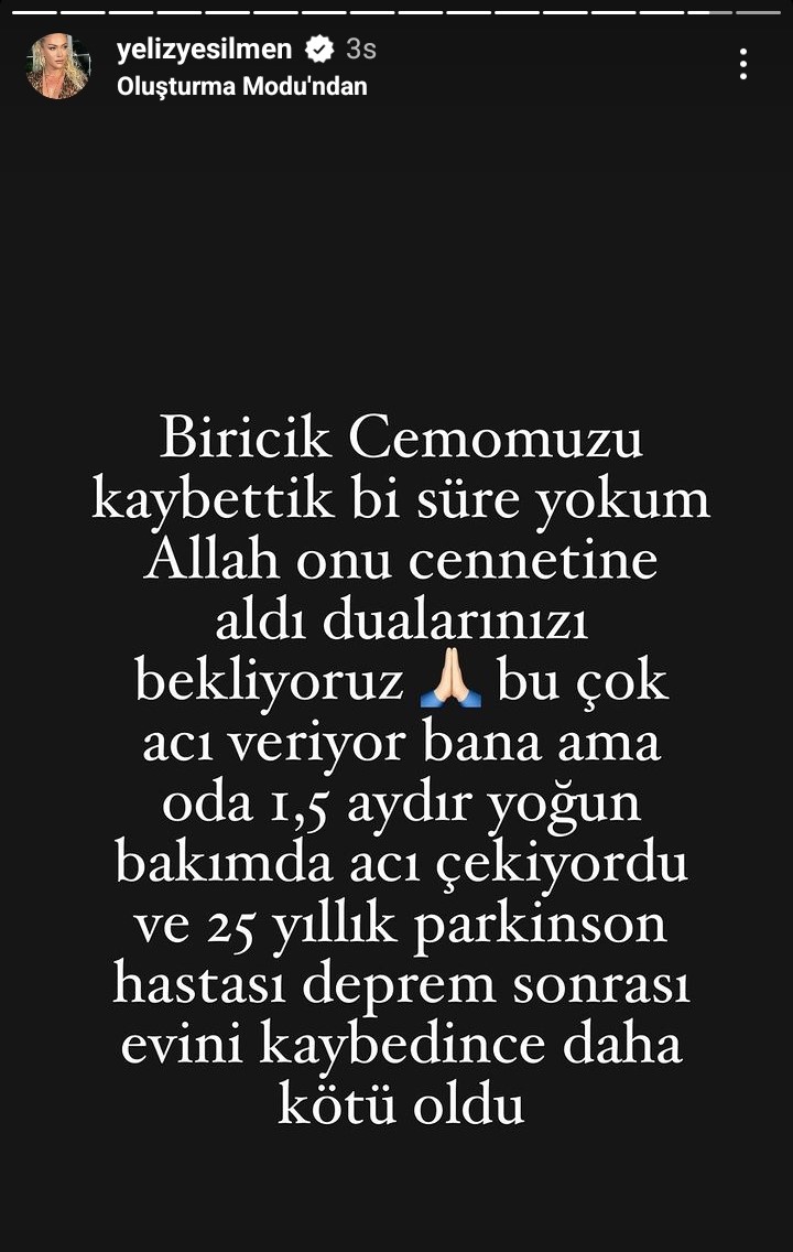 Yeliz Yeşilmen'in 25 yıldır Parkinson ile mücadele eden ve 1.5 aydır da yoğun bakımda tedavi gören babası Cemal Yeşilmen hayatını kaybetti. Oyuncu, "Biricik Cemomuzu kaybettik. Bir süre yokum. Allah onu cennetine aldı, dualarınızı bekliyoruz. Bu çok acı veriyor bana ama o da 1,5 aydır yoğun bakımda acı çekiyordu. 25 yıllık Parkinson hastası, deprem sonrası evini kaybedince daha kötü oldu.