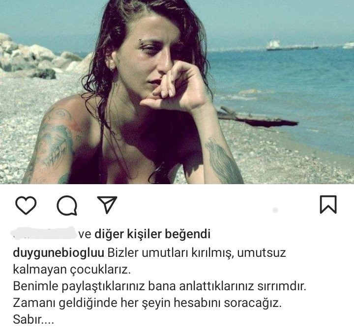 Instagram'dan açıklama yapan Duygu Nebioğlu, "Bizler umutları kırılmış, umutsuz kalmayan çocuklarız. Benimle paylaştıklarınız bana anlattıklarınız sırrımdır. Zamanı geldiğinde her şeyin hesabını soracağız. Sabır..." diye yazdı.
